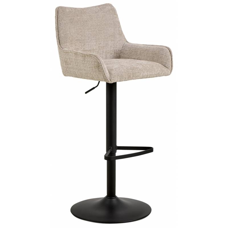 Elegantiška baro kėdė, kurioje dera komfortas ir paslaptis. Minkšta, smėlio spalvos „juto“ audinio sėdynė turi lengvai įgilintą formą su dekoratyviniu siuvimu, kas suteikia švelnaus stiliaus pojūtį.