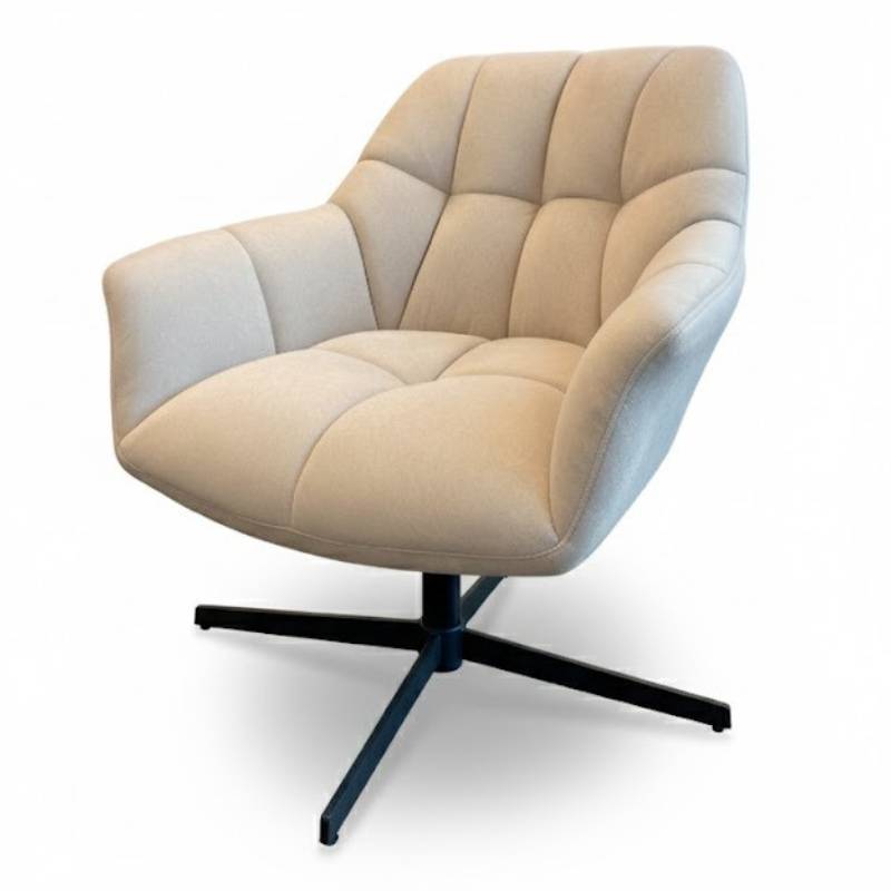Patogus, šviesus ir minkštas fotelis su sukimosi funkcija, juodomis kojomis ir giliu sėdėjimu – jaukumui, elegancijai ir komfortui.