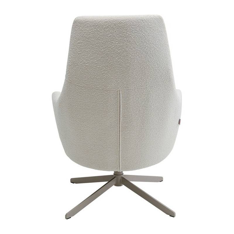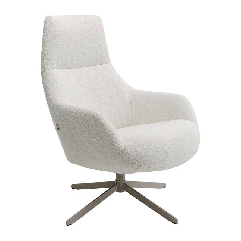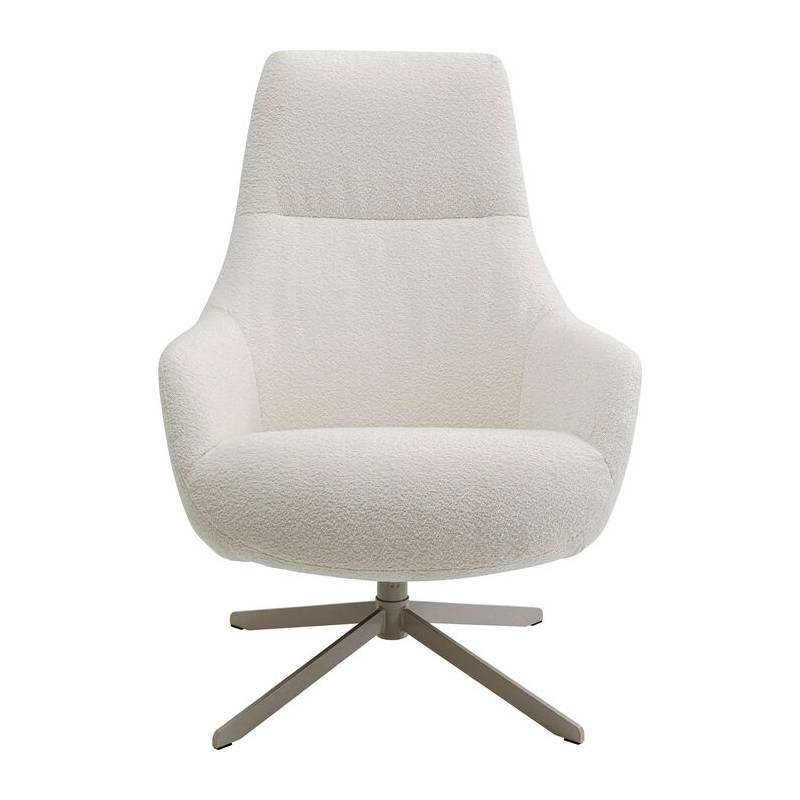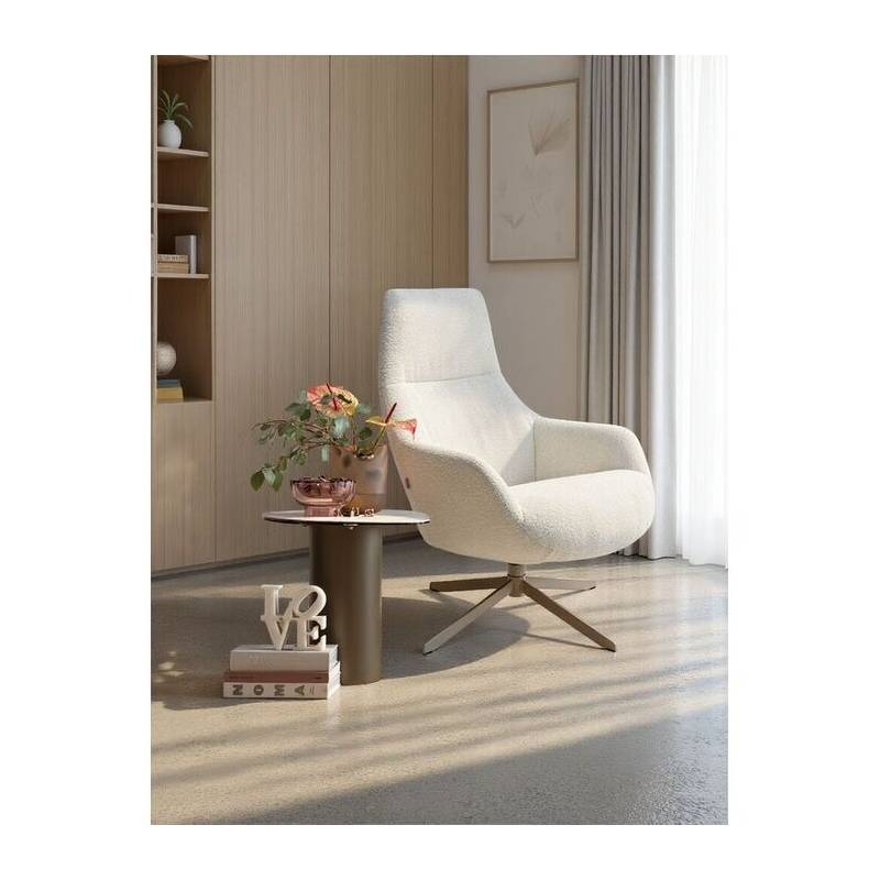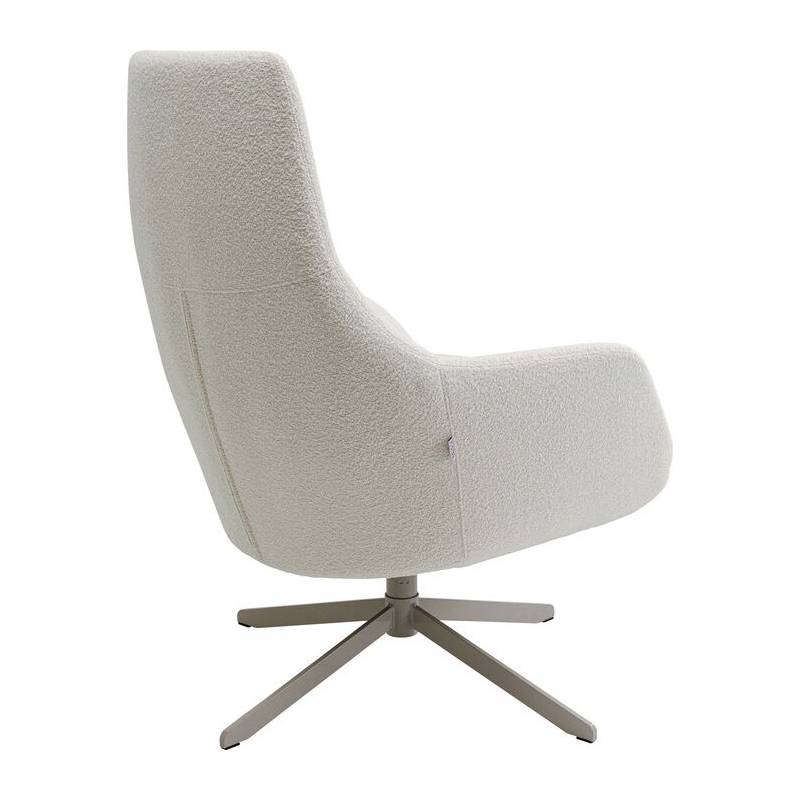 Modernus besisukantis fotelis su šviesiu bouclé audiniu ir tvirtu plieniniu pagrindu – stilingas ir itin patogus baldas poilsiui ar darbui.