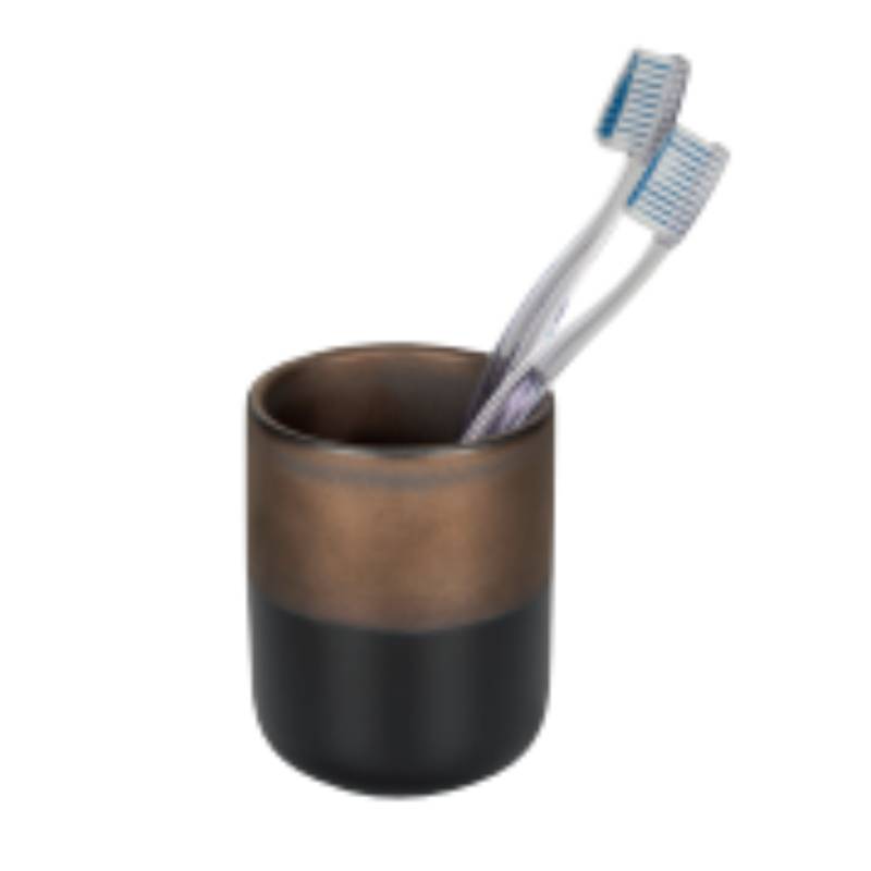 Elegantiškas keramikinis dantų šepetėlių laikiklis su matine juoda ir bronzine apdaila, suteikiantis voniai išskirtinio stiliaus.