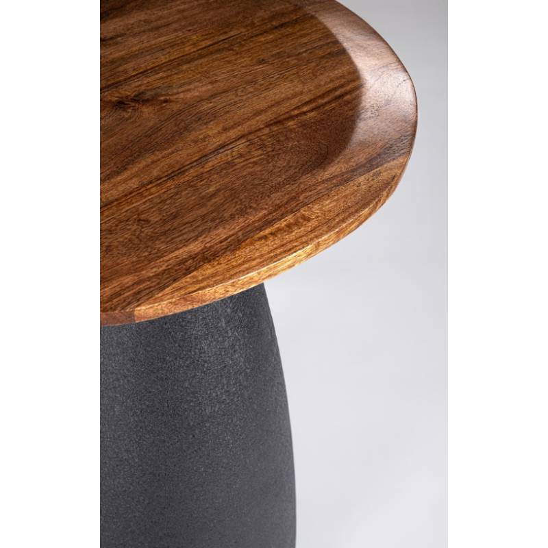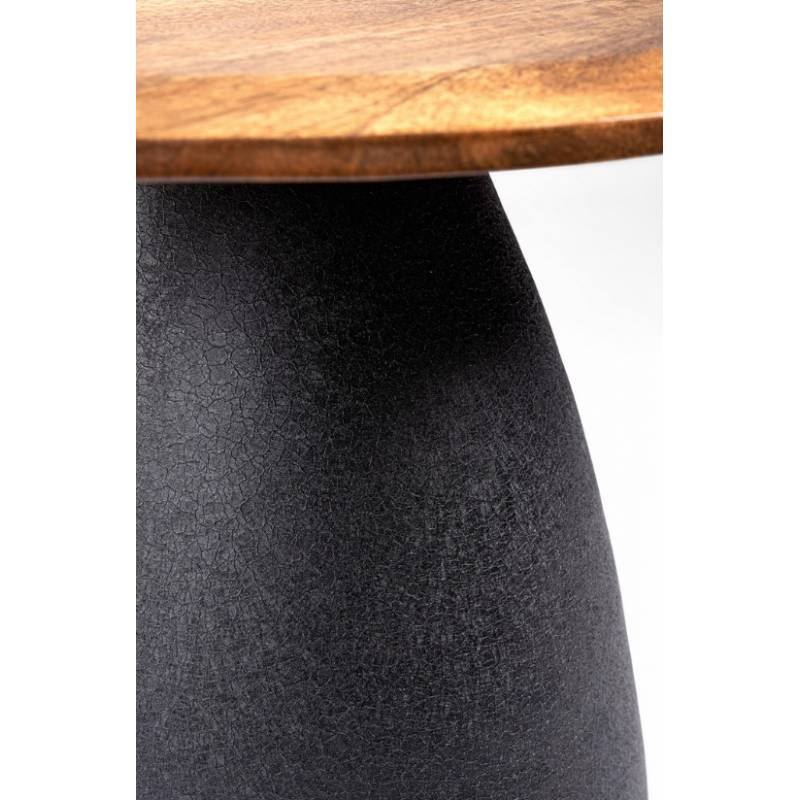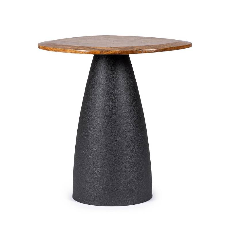 Šiuolaikiško dizaino staliukas iš mango medžio, pasižymintis išraiškinga forma ir tvirta plienine baze.