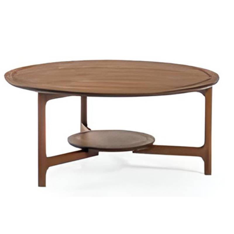 Apvalus kavos staliukas iš riešutmedžio, suteikiantis interjerui šilumos, natūralumo ir elegantišką, subalansuotą akcentą.