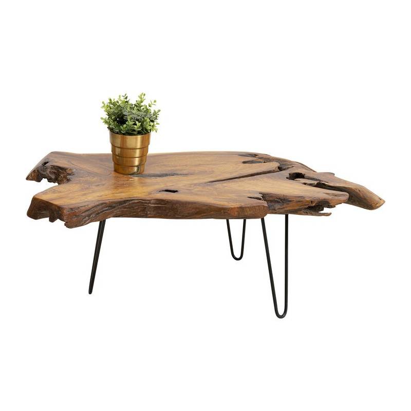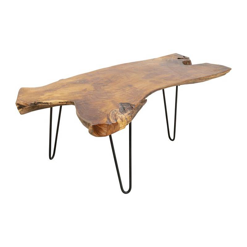 Unikalus kavos staliukas iš natūralaus tiko medienos su plonomis metalinėmis kojelėmis – industrinio stiliaus ir gamtos harmonija.