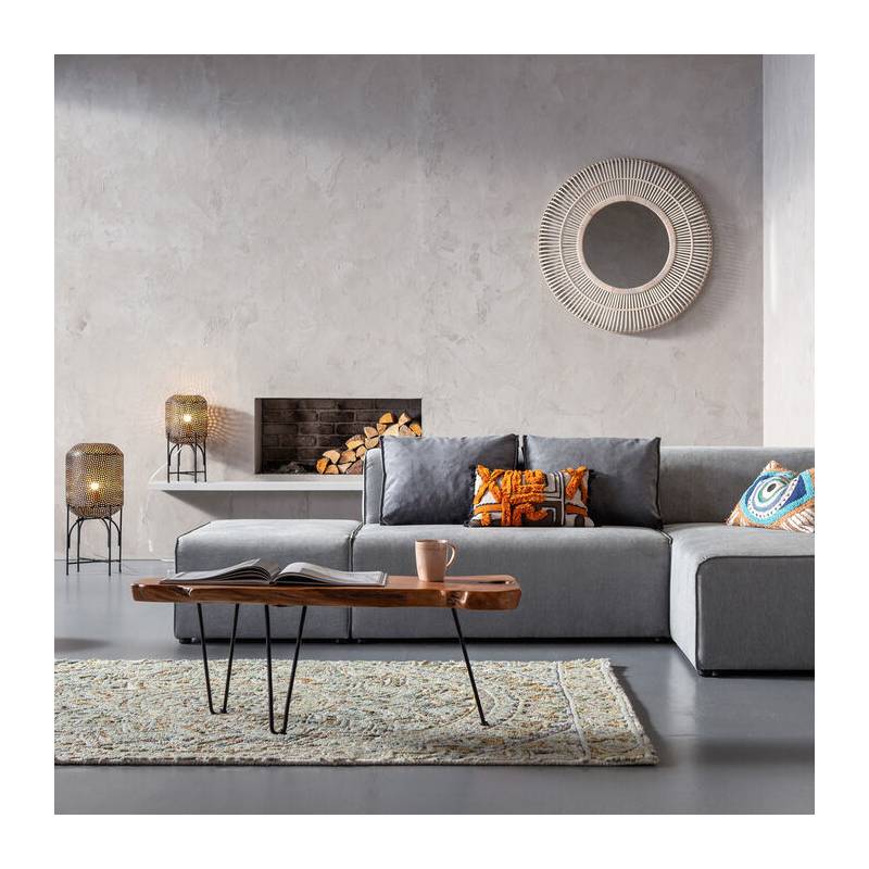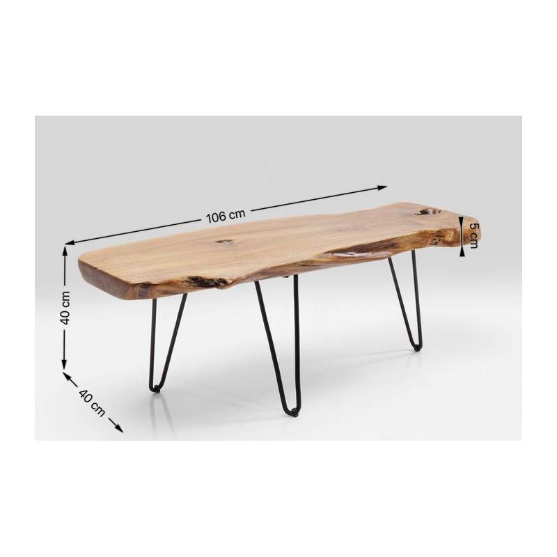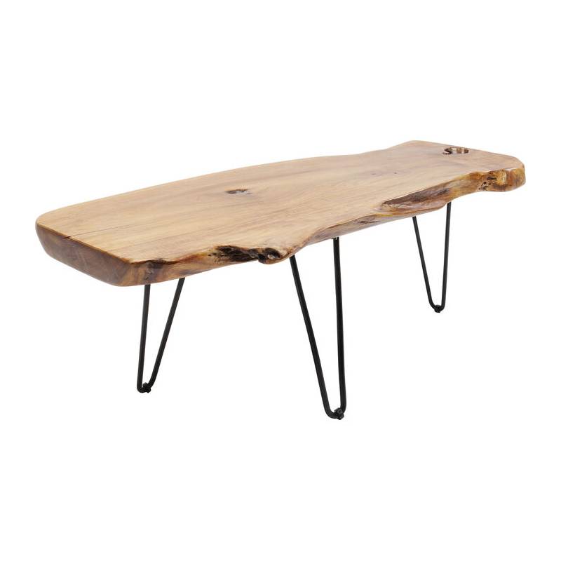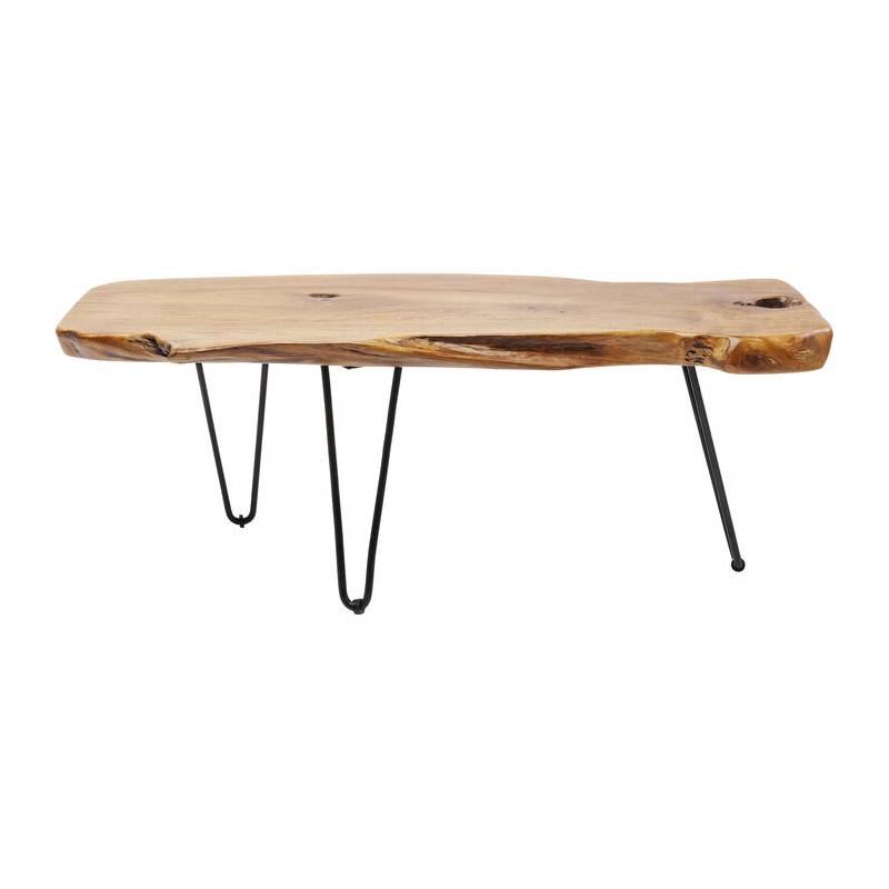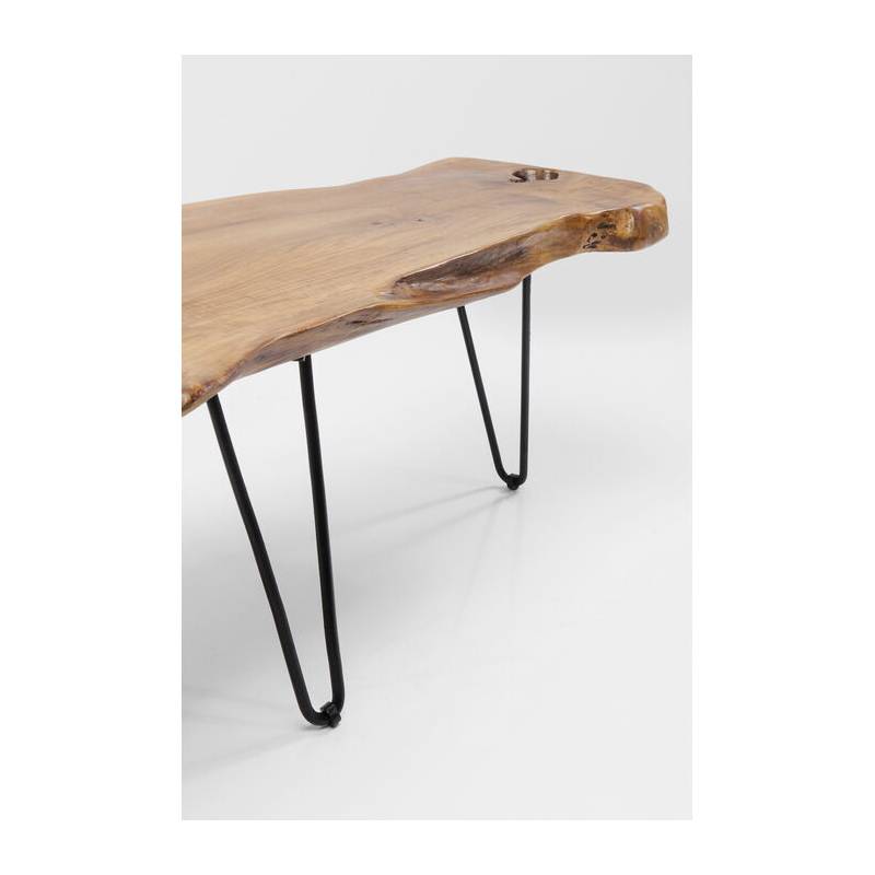 Kavos staliukas ASPEN NATURE apjungia natūralumą ir industrinį charakterį. Nelygios formos stalviršis iš vientiso tikmedžio masyvo išlaiko autentišką medžio raštą ir šilumą, o plonos juodos plieno kojelės suteikia staliukui lengvumo bei vizualinio kontrasto.