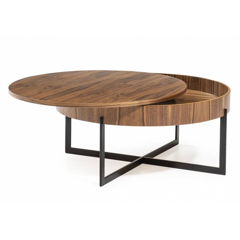 Apvalus kavos staliukas su riešuto atspalvio stalviršiu ir juodo metalo kojomis, suteikiantis interjerui jaukumo ir elegancijos.