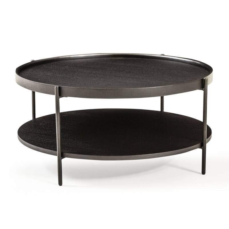 Modernus kavos staliukas su juodo metalo kojomis ir pasirenkamu ąžuolo, riešuto arba juodu stalviršiu, tinkantis įvairiems interjerams.