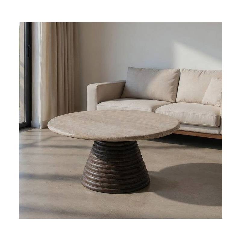 Apvalus kavos staliukas su marmuro viršumi ir mango medžio konstrukcija – prabangus centrinis akcentas jūsų svetainei.