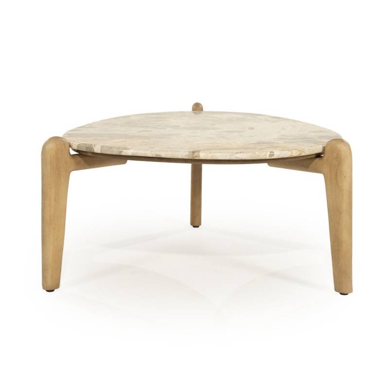 Prabangus kavos staliukas iš mango medienos ir poliruoto marmuro, suteikiantis svetainei natūralumo, elegancijos ir išskirtinumo.