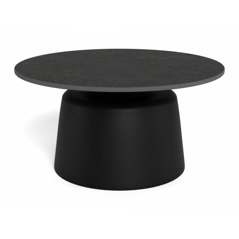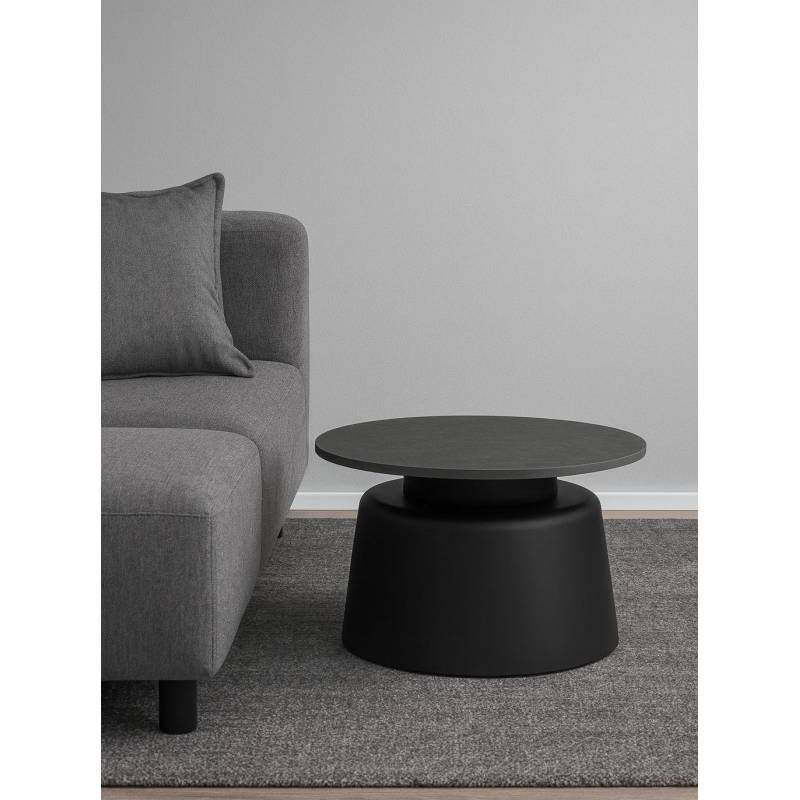Kavos staliukas NEILL – apvalus, su juodos Cupa Rough keramikos stalviršiu ir plačia juoda metaline koja. Ø70x36 cm.