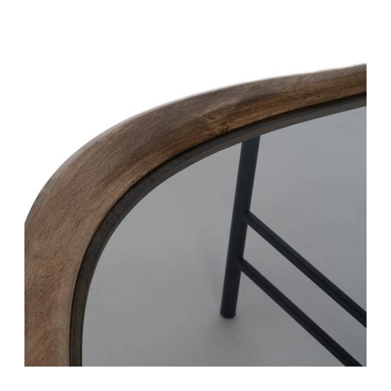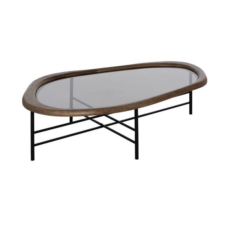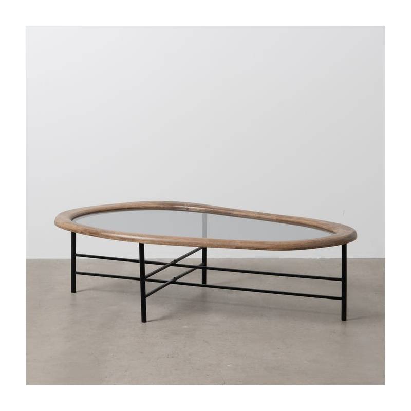 Modernus kavos staliukas su natūraliu medžio stalviršiu, stiklo intarpu ir juodo metalo rėmu – elegancija ir funkcija viename.