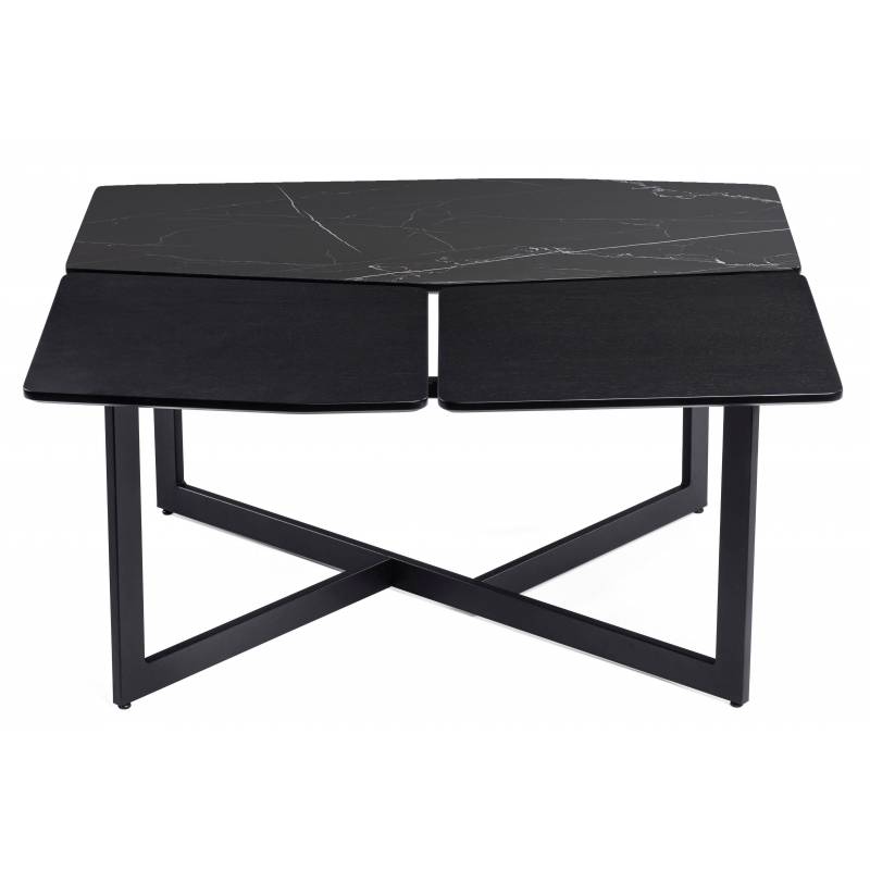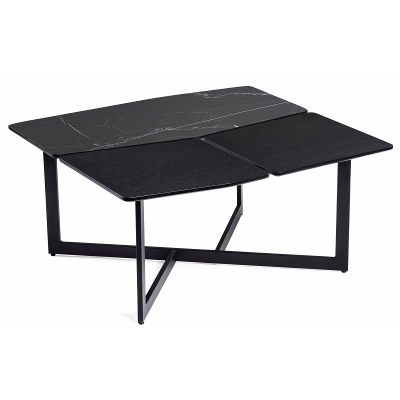 Dizaino akcentas – kavos staliukas TITO su dviem paviršiais: juodu MDF ir stiklo keramika su marmuro raštu. Dydis 90x88 cm.