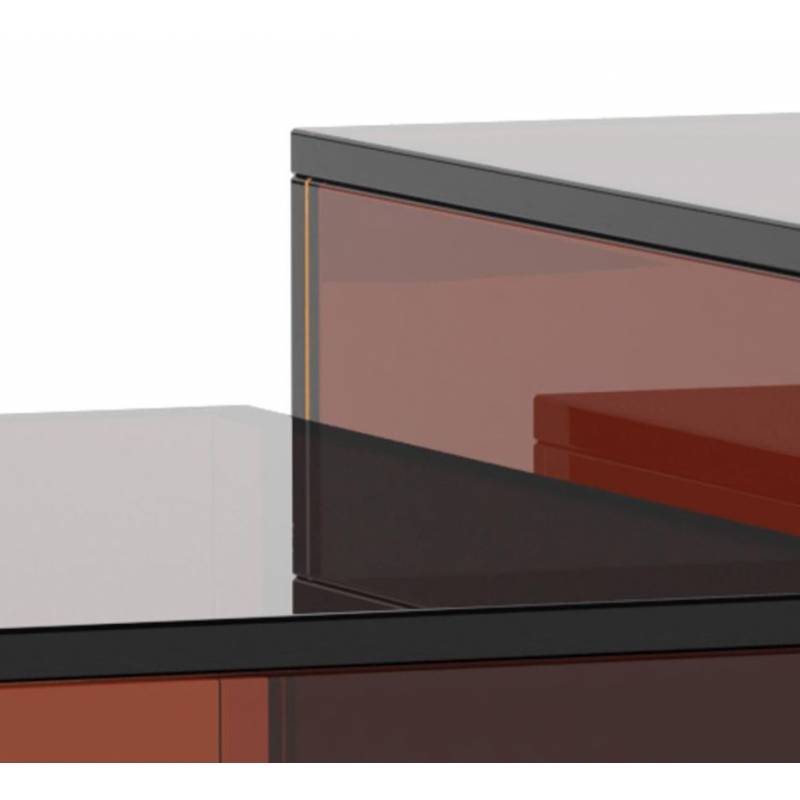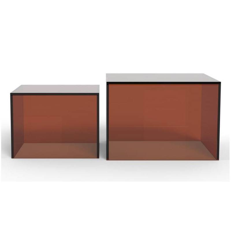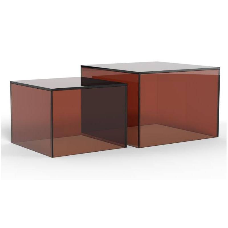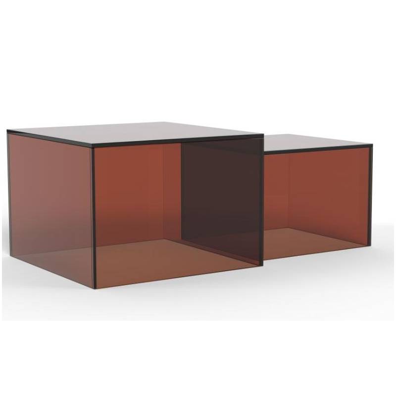 Stilingas dviejų kavos staliukų komplektas iš rudo stiklo, suteikiantis interjerui šilumos ir modernaus lengvumo.