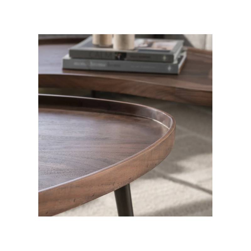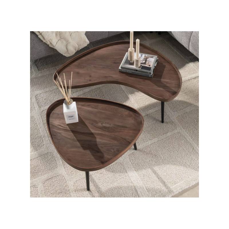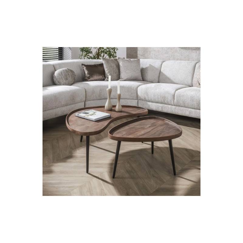 CARVE kavos staliukų komplektas išsiskiria natūraliu akacijos medienos grožiu ir šiltu rudos spalvos atspalviu. Organiškų formų stalviršiai su pakeltais kraštais suteikia baldui išskirtinumo ir praktiškumo kasdieniam naudojimui.