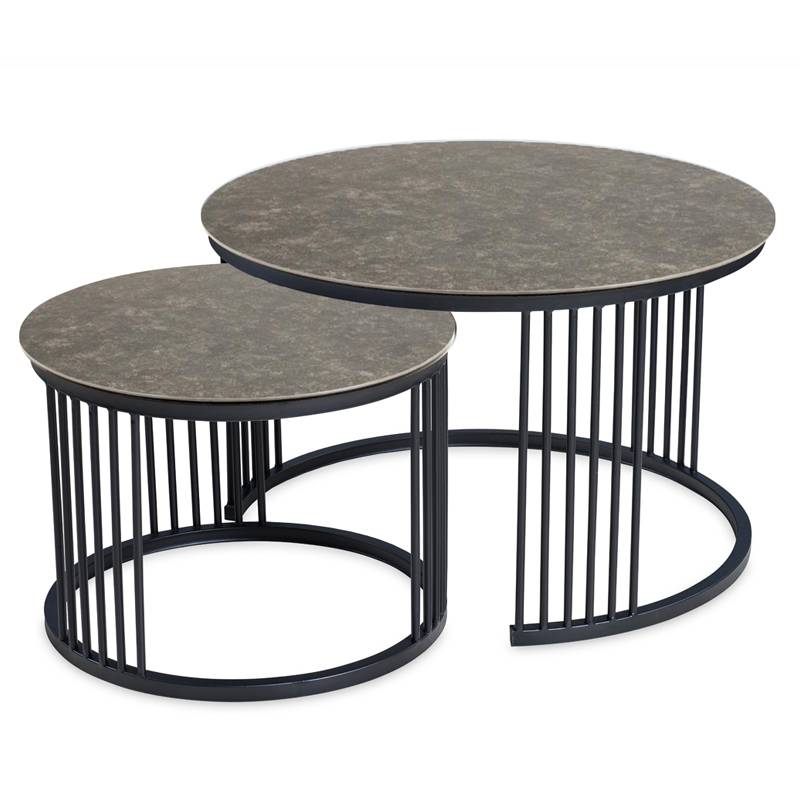 Rudos spalvos kavos staliukų komplektas ELON su keramikiniu stalviršiu. Atrodo ypač prabangiai ir stilingai, tad pagyvins jūsų interjerą.