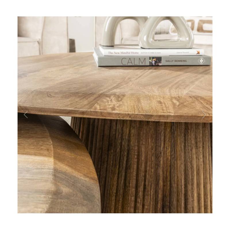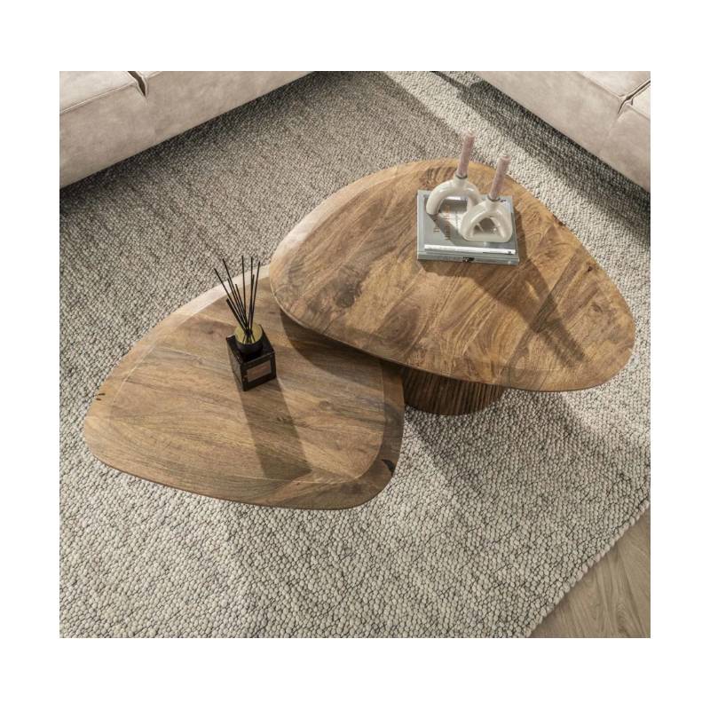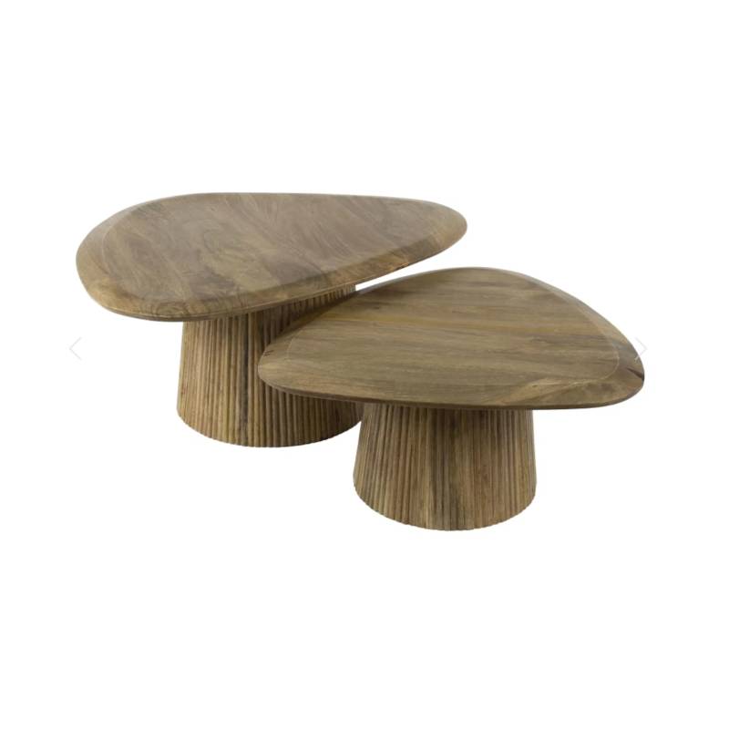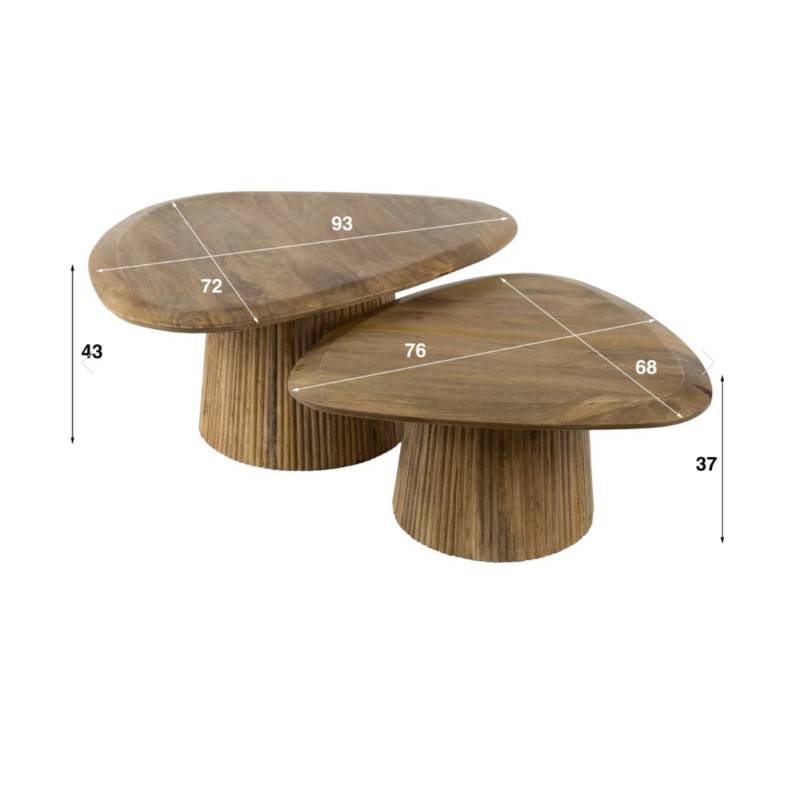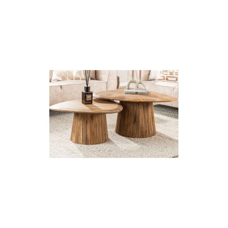Šis kavos staliukų komplektas išsiskiria unikaliu dizainu ir funkcionalumu. Trikampės formos stalviršiai iš mango medienos suteikia natūralumo, o švelnus smėlio atspalvis kuria jaukią ir šiltą atmosferą interjere.