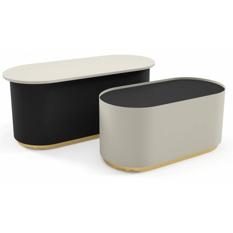 Kavos staliukų komplektas MALI – dviejų ovalių, skirtingo dydžio staliukų rinkinys su juodomis metalinėmis kojomis ir laminuotu stalviršiu.