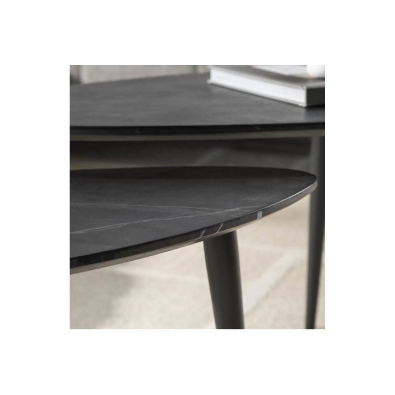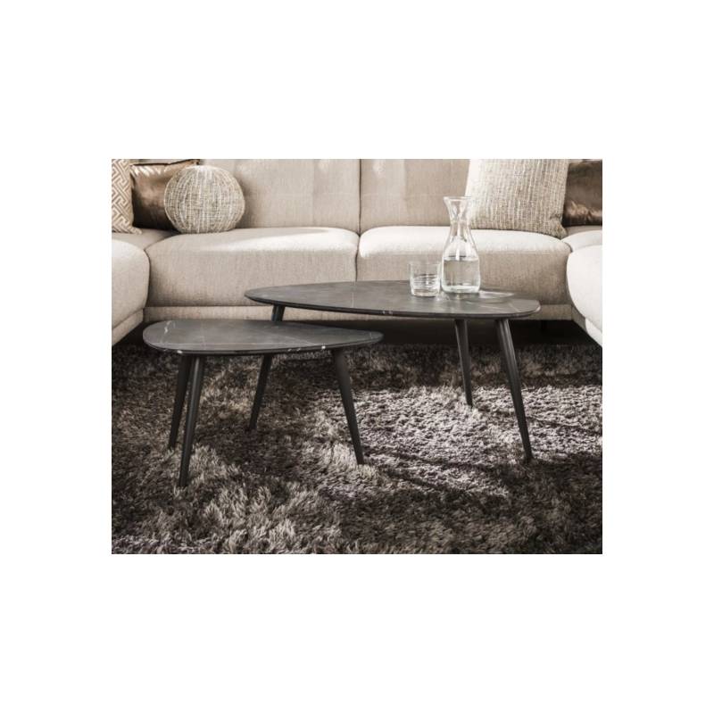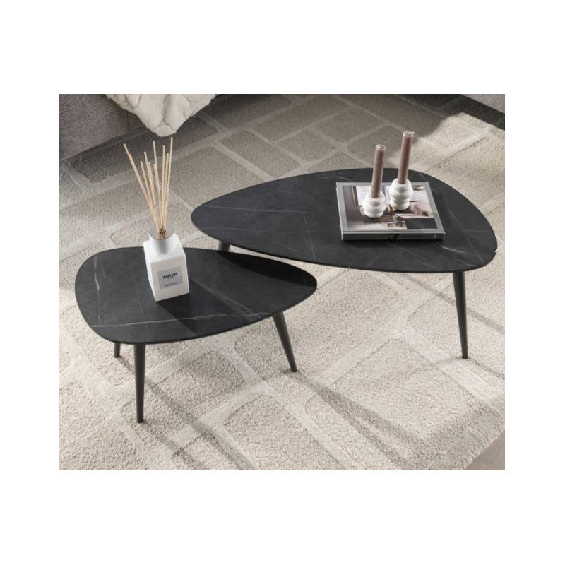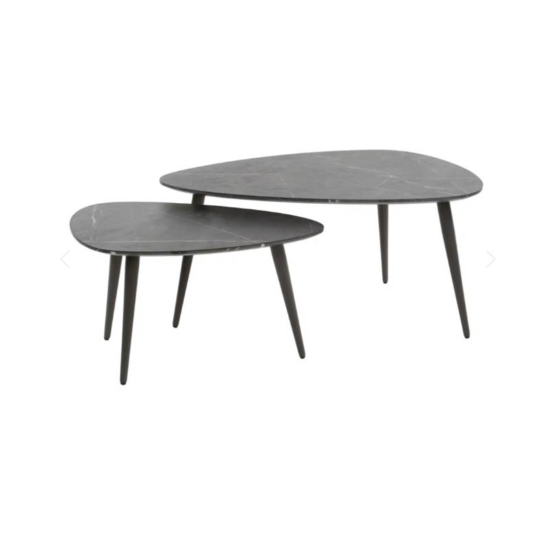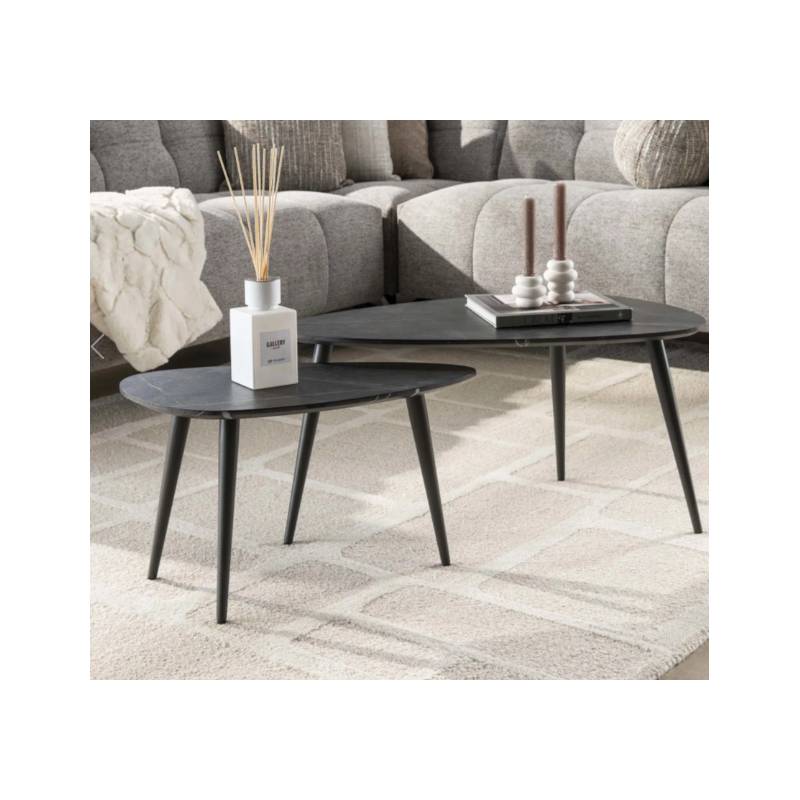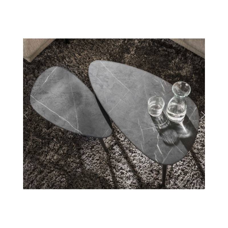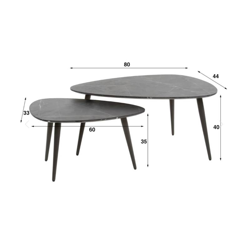 ONYX kavos staliukų komplektas išsiskiria elegantiška kriaušės forma ir natūralaus akmens imitacijos paviršiumi, kuris suteikia prabangos pojūtį. Rankų darbo stalviršis su nuožulniu kraštu dengtas melamino sluoksniu, todėl yra atsparus kasdieniam naudojimui ir lengvai prižiūrimas.