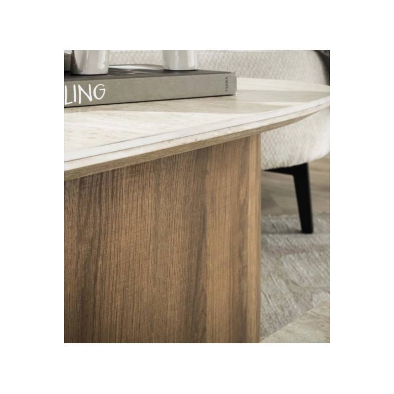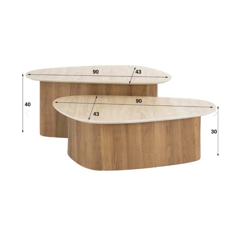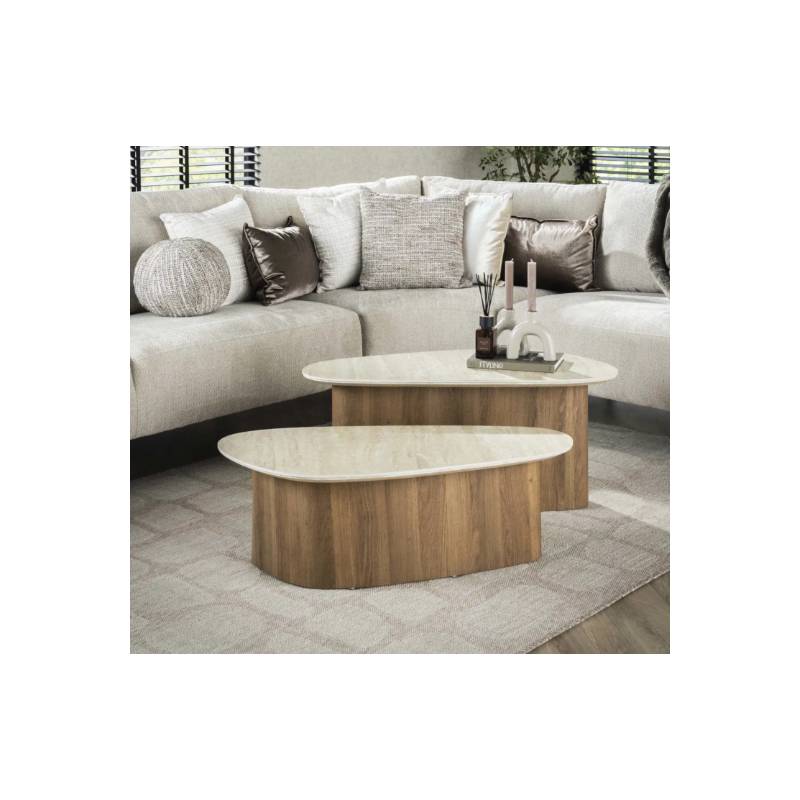 ROMANO kavos staliukų komplektas pasižymi išskirtine trikampe forma ir elegantiškais travertino imitacijos keramikiniais stalviršiais, kurie suteikia interjerui natūralumo ir modernios prabangos. Šiltų tonų ąžuolo išvaizdos pagrindas kuria harmoningą ir jaukų bendrą vaizdą.