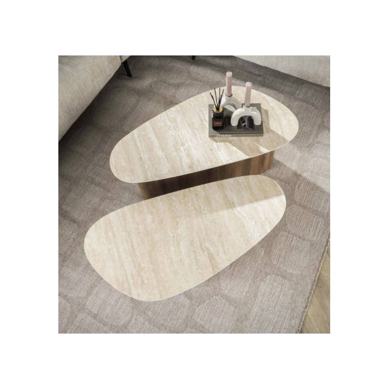 Dviejų kavos staliukų komplektas su travertino imitacijos keramika ir trikampe forma, modernus ir išskirtinis.