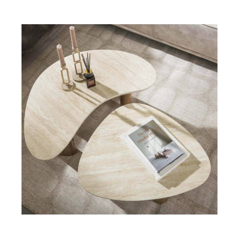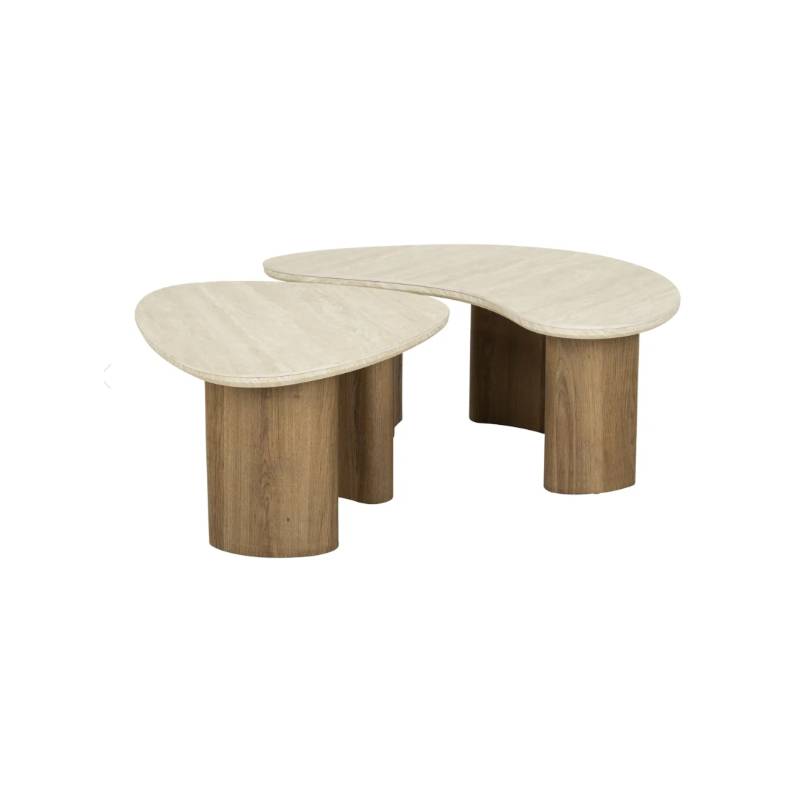Organinių formų kavos staliukų komplektas su travertino imitacijos keramika ir ąžuolo išvaizdos kojomis.