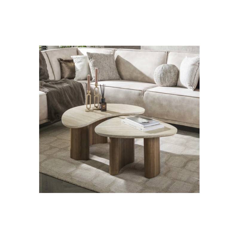 ROMI kavos staliukų komplektas išsiskiria švelniomis organinėmis formomis ir elegantiškais travertino imitacijos keramikiniais stalviršiais, kurie suteikia interjerui natūralios prabangos pojūtį. Skulptūriškos, šilto ąžuolo atspalvio kojos papildo dizainą ir sukuria harmoningą visumą.