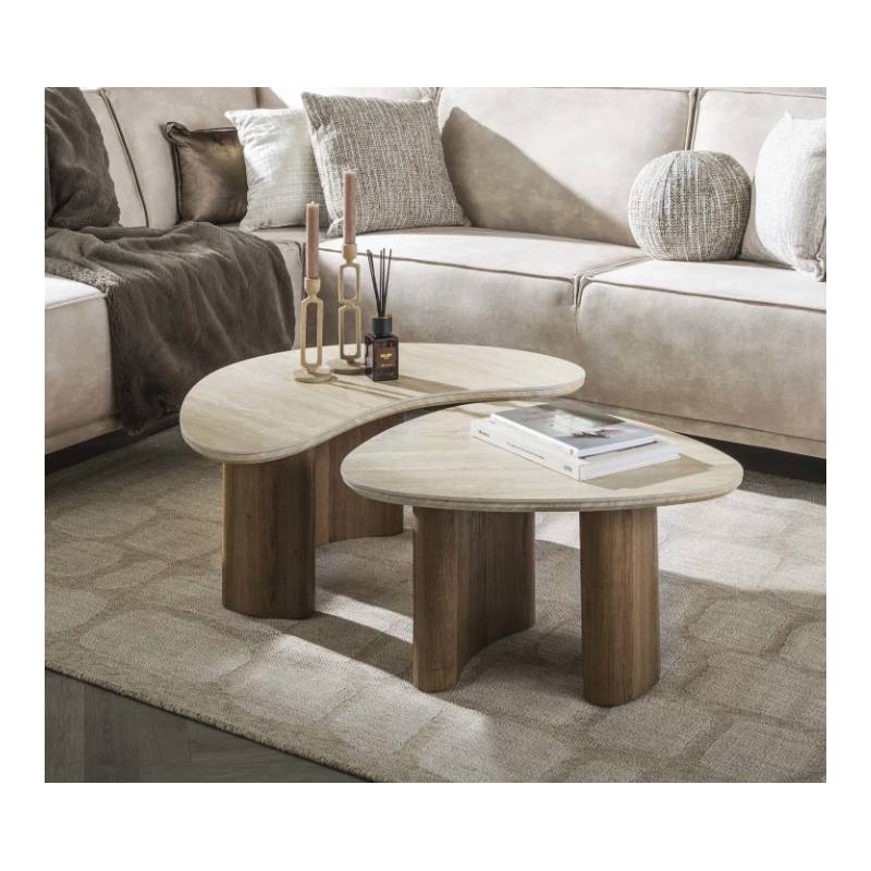 Organinių formų kavos staliukų komplektas su travertino imitacijos keramika ir ąžuolo išvaizdos kojomis, stilingas ir praktiškas.