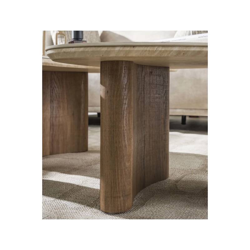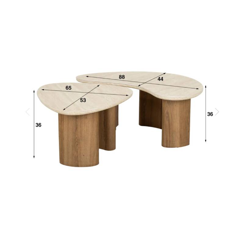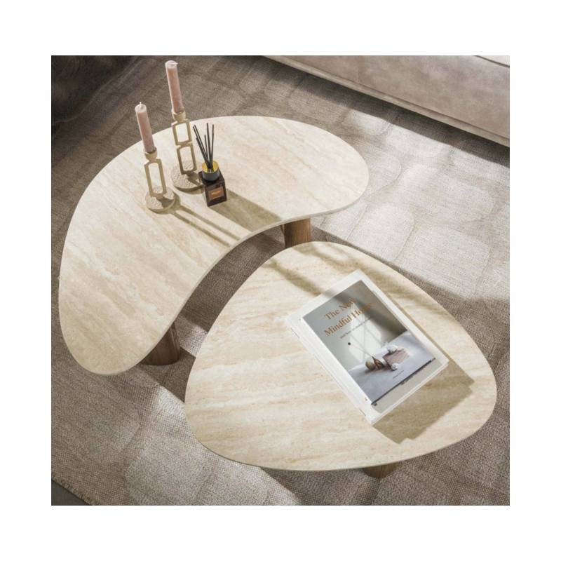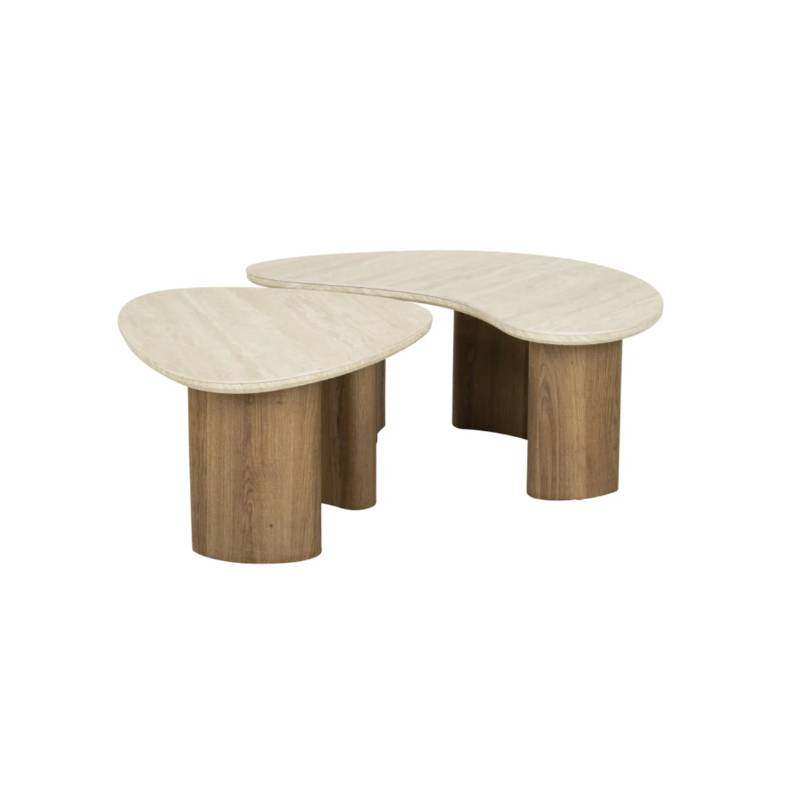 TRAVA kavos staliukų komplektas pasižymi elegantiškomis organinėmis formomis ir travertino imitacijos keramikos stalviršiais, kurie suteikia interjerui natūralumo ir prabangos pojūtį. Skulptūriškos, šilto ąžuolo atspalvio kojos kuria harmoningą derinį ir išskirtinį dizainą.