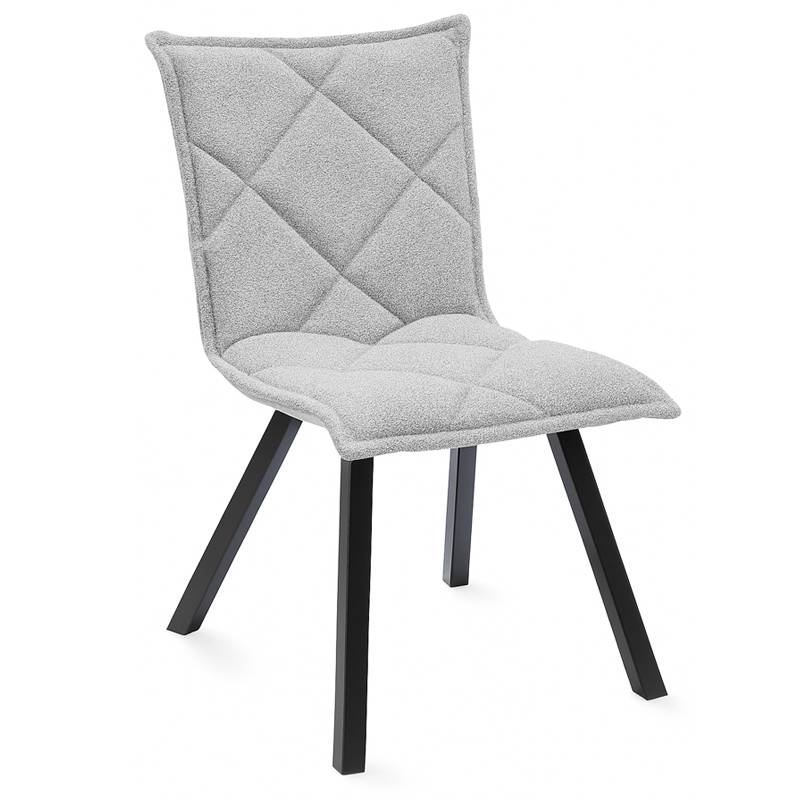 Dekoratyvinis rombo formos dygsniavimas suteikia kėdei vizualinio dinamiškumo, o šiek tiek lenktas atlošas užtikrina patogią laikyseną. Kėdės pagrindą sudaro stabilios, juodai dažytos metalinės kojos, kurios papildo bendrą minimalistinį dizainą.