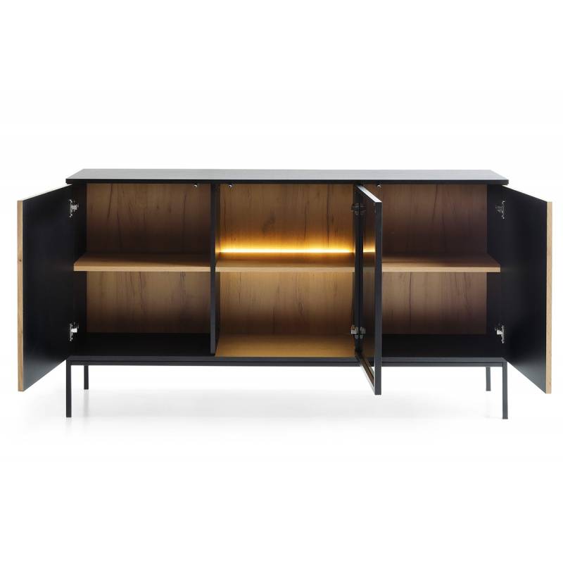 Komoda turi push to open atidarymo sistemą, tris dureles ir vidines lentynas, kurios užtikrina patogų daiktų laikymą. Integruotas LED apšvietimas suteikia jaukumo ir papildomo vizualinio efekto, todėl baldas tampa ne tik praktiškas, bet ir dekoratyvus.