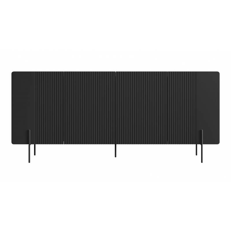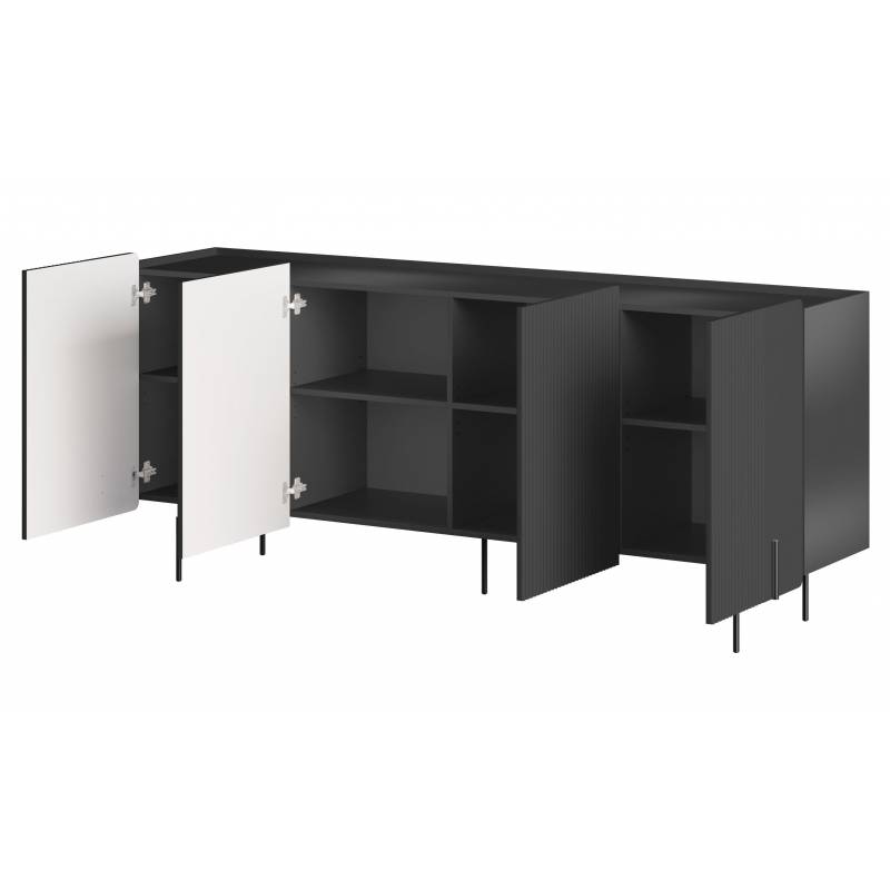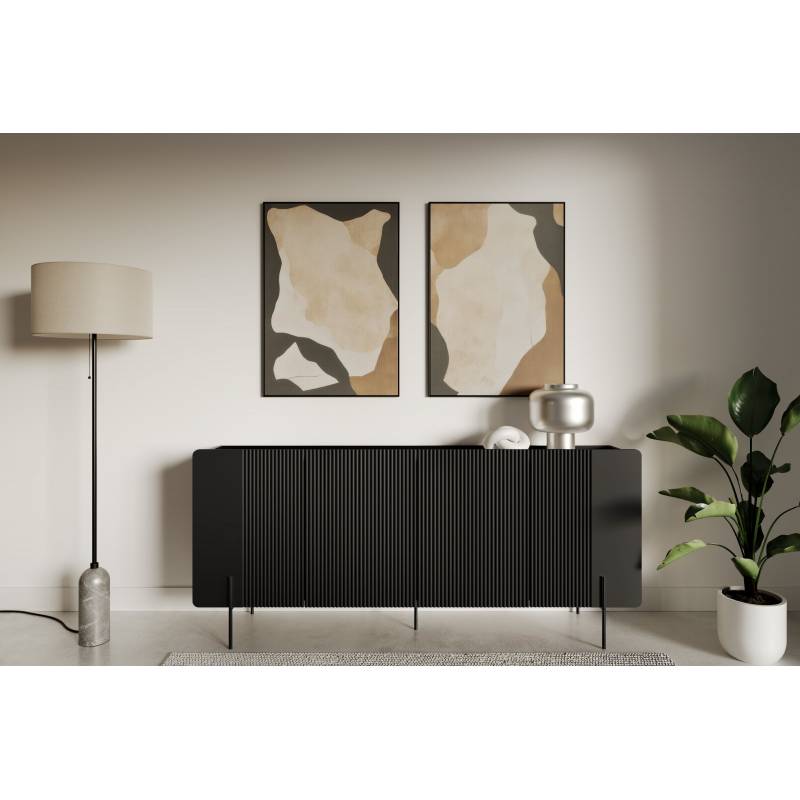 Erdvi keturių durų komoda su subtiliais grioveliais ir metalinėmis kojelėmis – modernus baldas stilingam interjerui.