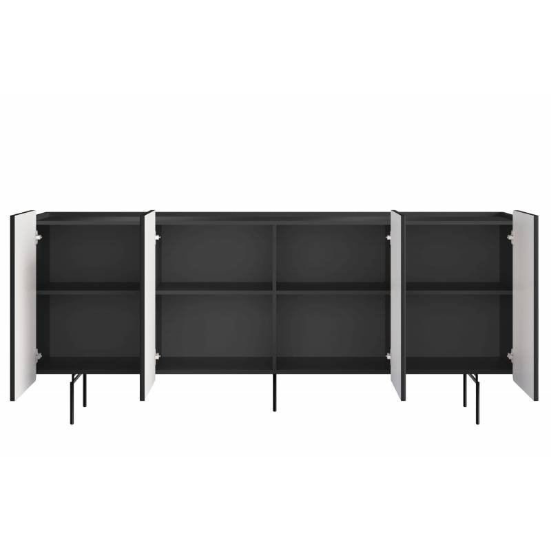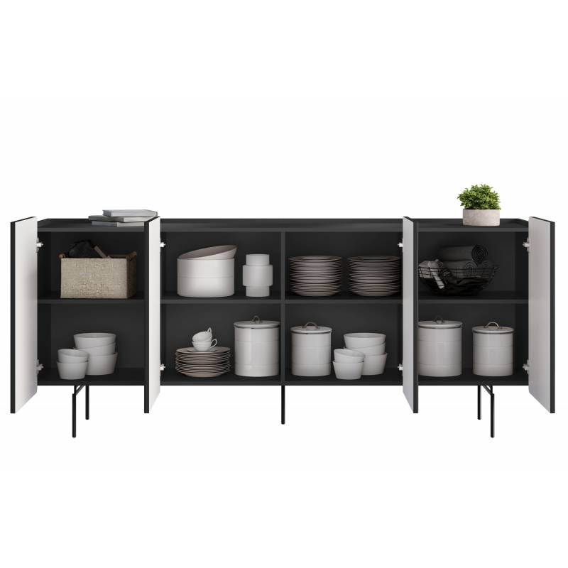 Korpusas pagamintas iš 16 mm laminuotos plokštės, o priekinės dalys – iš 18 mm MDF plokštės, užtikrinančios aukštą kokybę ir ilgaamžiškumą. Metalinės, milteliniu būdu dažytos rėmo tipo kojelės suteikia stabilumo ir palengvina baldą vizualiai, o veltinio padeliai saugo grindis nuo įbrėžimų. Ketverios durelės su tyliai užsidarančiais vyriais užtikrina patogų naudojimą, o viduje esančios lentynos gali būti reguliuojamo aukščio – lengva pritaikyti pagal savo poreikius.