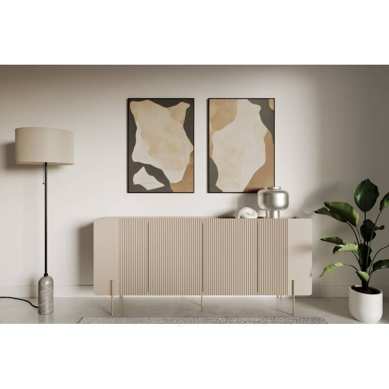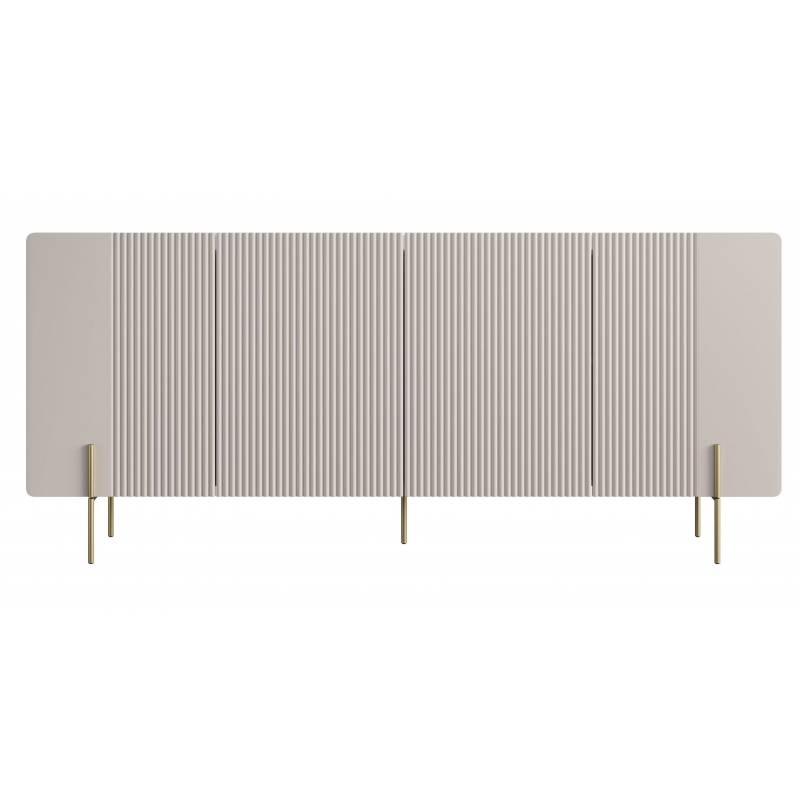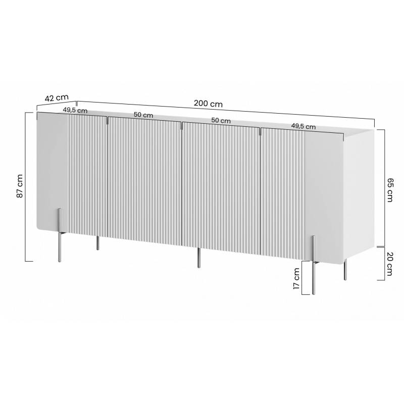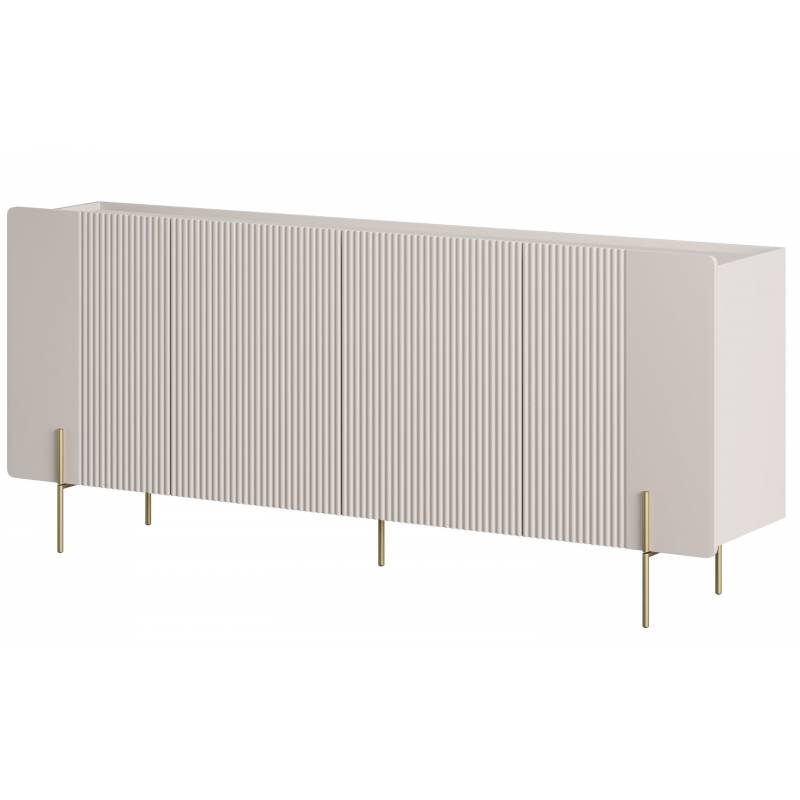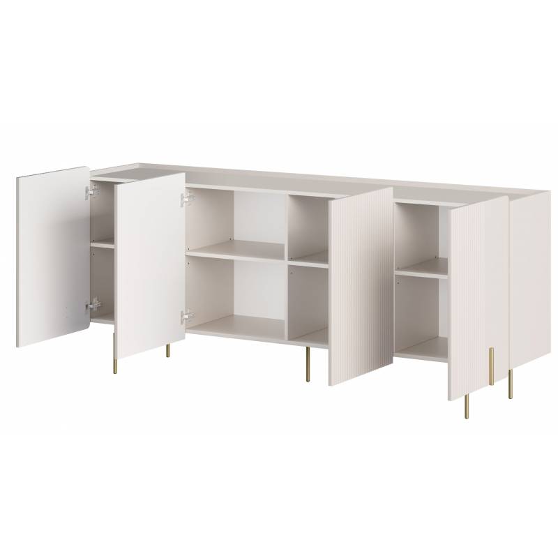 Erdvi keturių durų komoda su subtiliais grioveliais ir metalinėmis kojelėmis – modernus baldas stilingam interjerui.