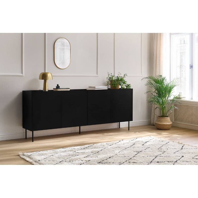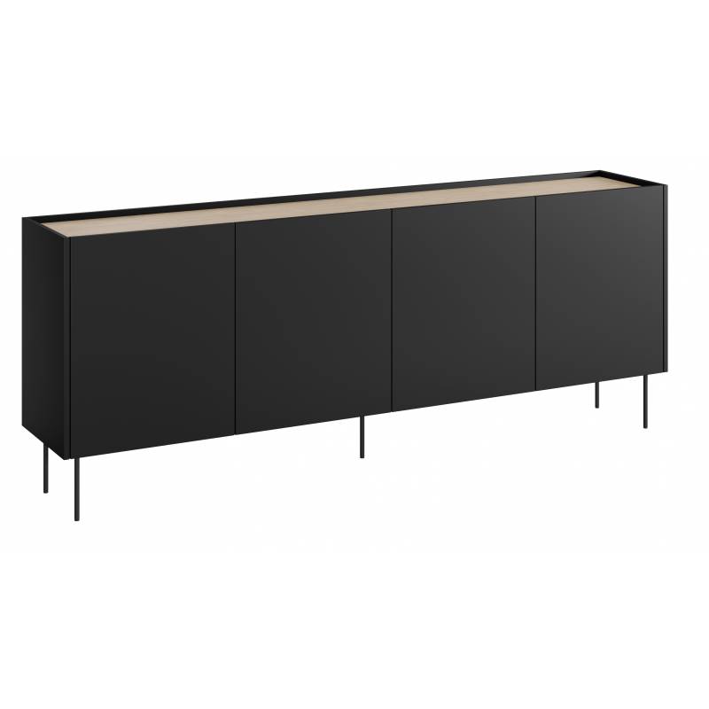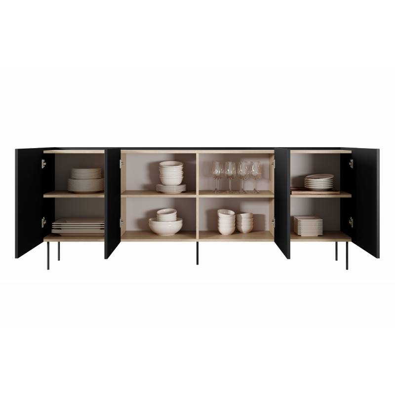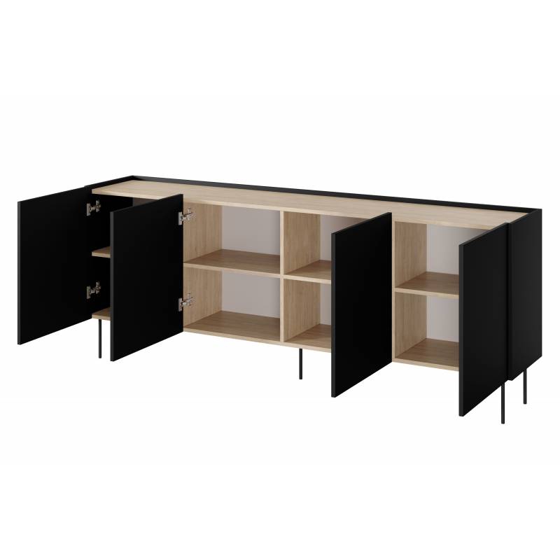 Keturių durelių konstrukcija užtikrina talpų daiktų laikymą, o pakeltos kojelės suteikia lengvumo ir palengvina grindų priežiūrą. Tai praktiškas pasirinkimas svetainei, miegamajam ar prieškambariui, kuriame dera estetika ir funkcionalumas.