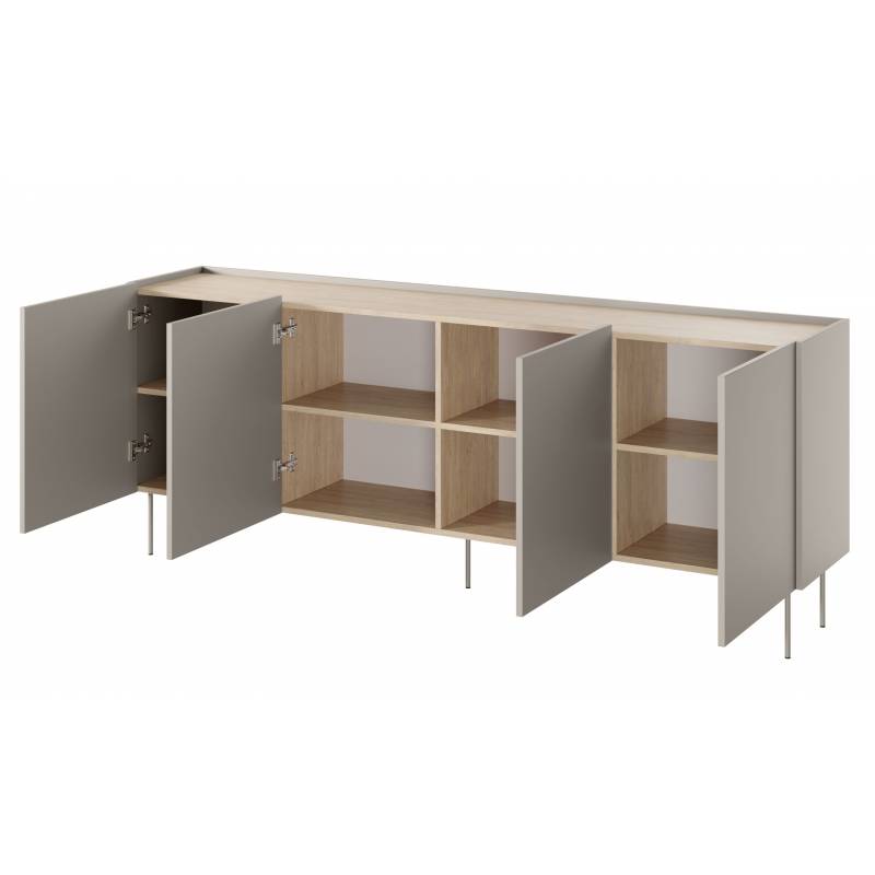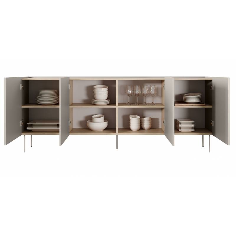 Keturių durelių konstrukcija suteikia daug vietos daiktų laikymui, todėl komoda puikiai tinka tiek svetainei, tiek miegamajam ar prieškambariui. Tai praktiškas pasirinkimas, kuriame dera estetiškas vaizdas ir kasdienis patogumas.