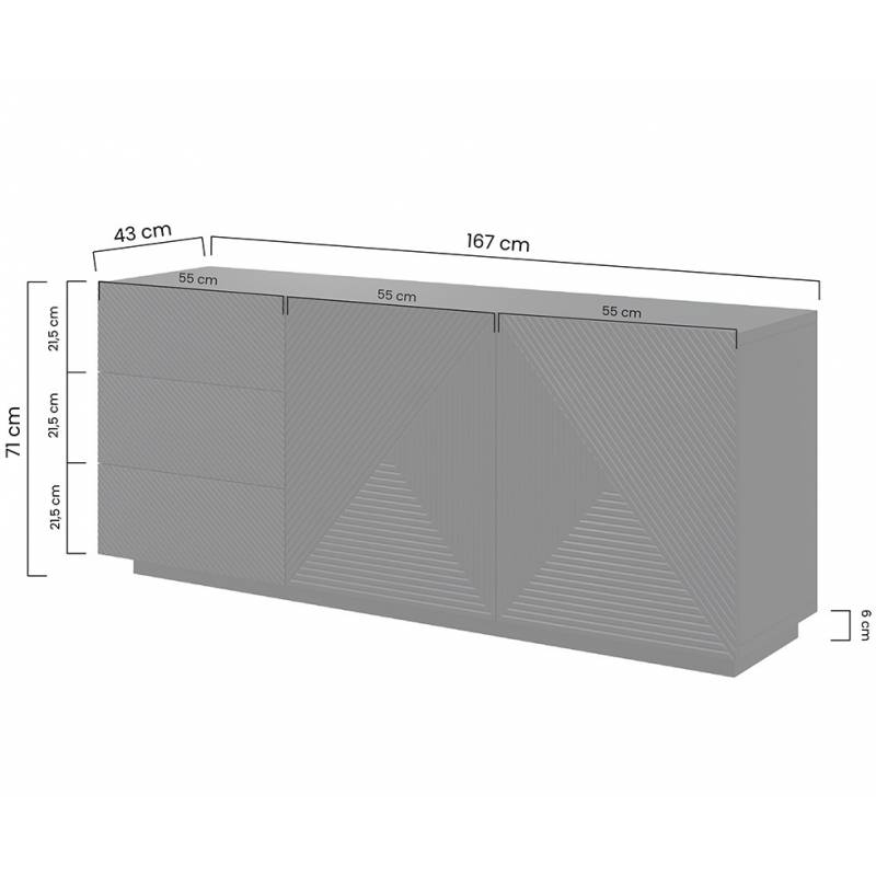 Korpusas pagamintas iš laminuotos 16 mm plokštės, priekis iš frezuotos MDF plokštė + PVC folija – 16 mm. Kuriant šią komodą panaudoti modernūs ir patvarūs elementai. Vienas iš jų – kokybiška laminuota plokštė, kuri yra atspari drėgmei, saulės spinduliams ir įvairiems mechaniniams pažeidimams.
