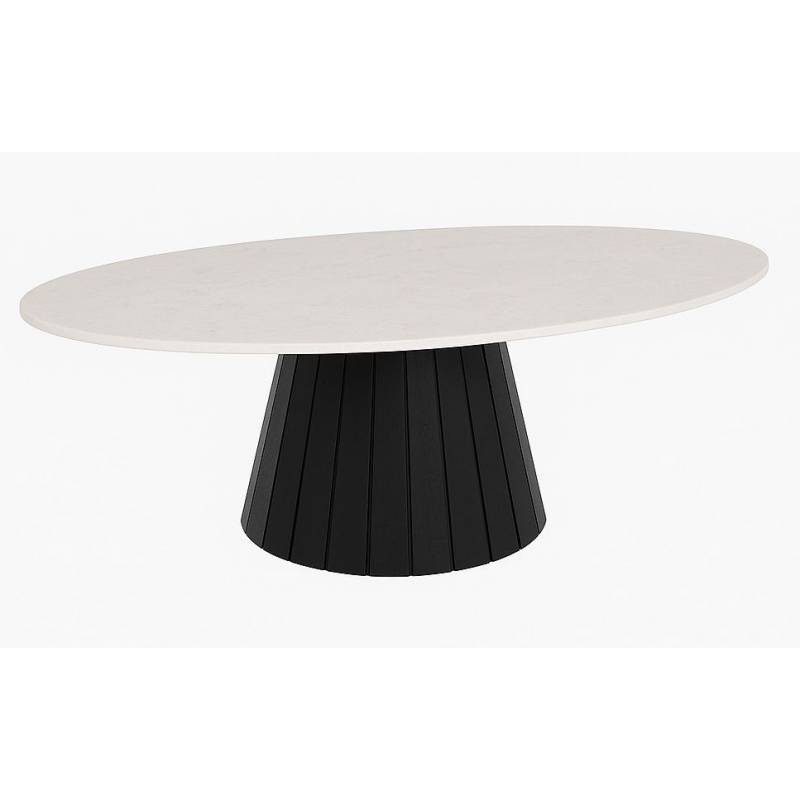 Kavos staliukas JAZZ – elegantiškas akcentas su šviesiu ovaliu stalviršiu ir masyvia juoda baze. Modernus dizainas jūsų svetainei.