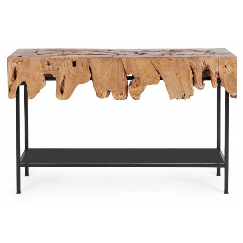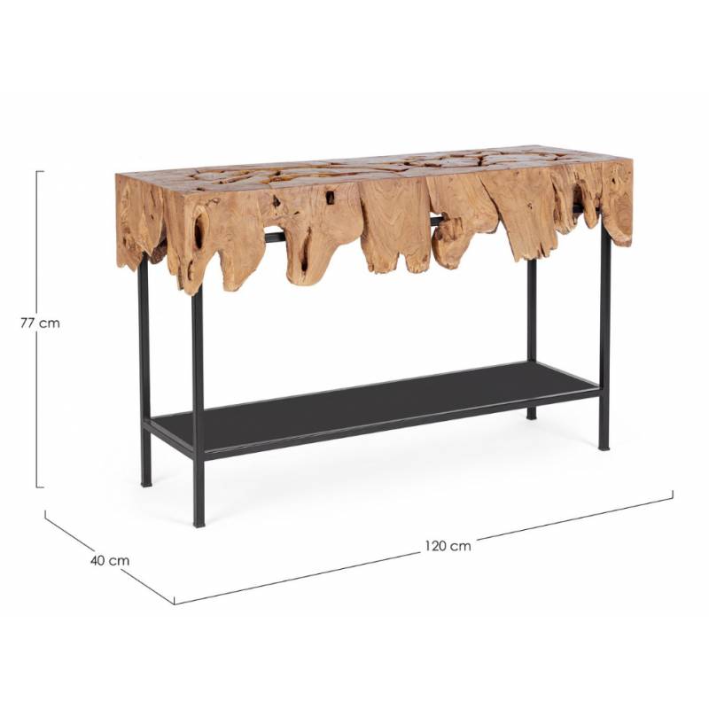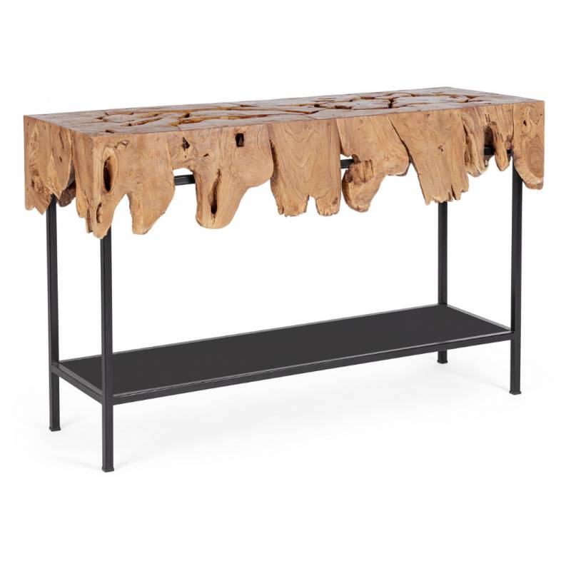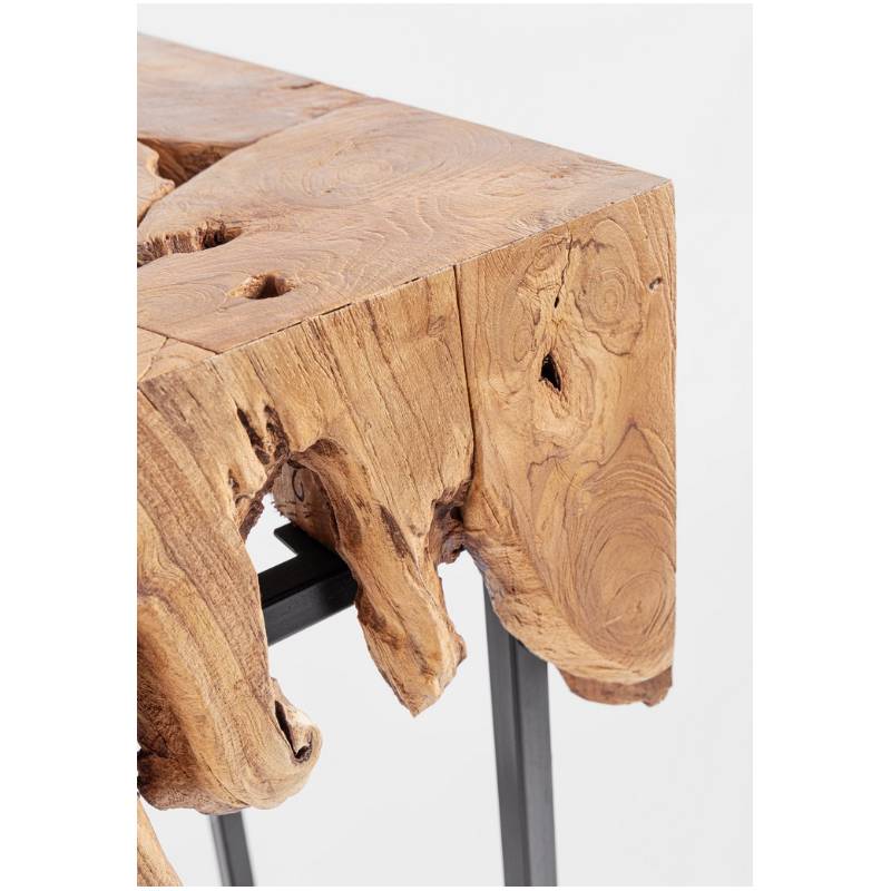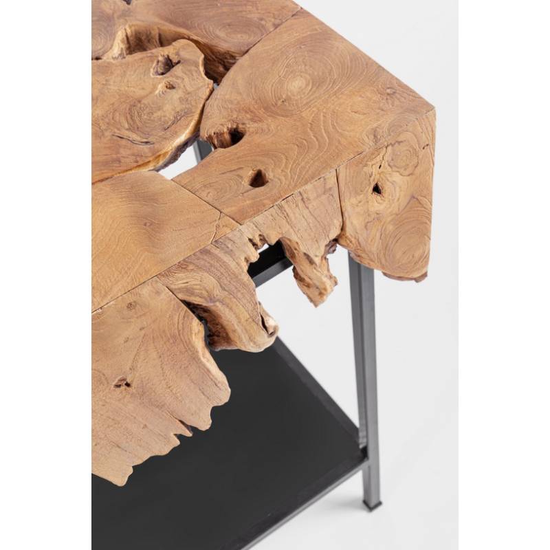 Iš tikmedžio šaknų formuota unikali konsolė su tvirta plienine baze, suteikianti interjerui natūralų ir išskirtinį akcentą.