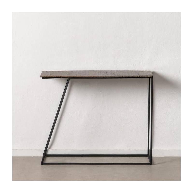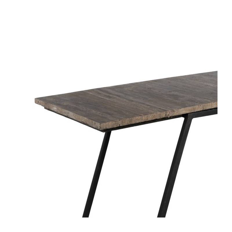 Konsolės stalviršis pagamintas iš natūralaus travertino marmuro, kuriam būdingos unikalios spalvos bei raštai, suteikiantys kiekvienam gaminiui individualaus žavesio. Stalo konstrukcija – tvirta, plona juodo geležies sistema, kuri ne tik stabilizuoja formą, bet ir puikiai dera prie marmuro elegancijos.