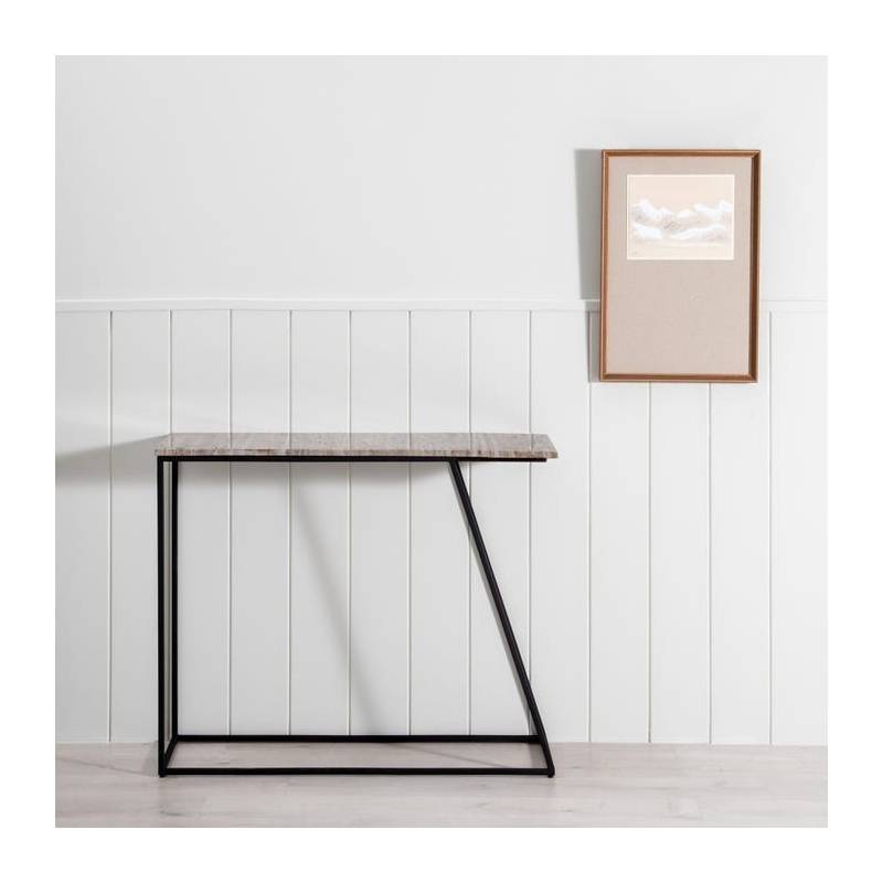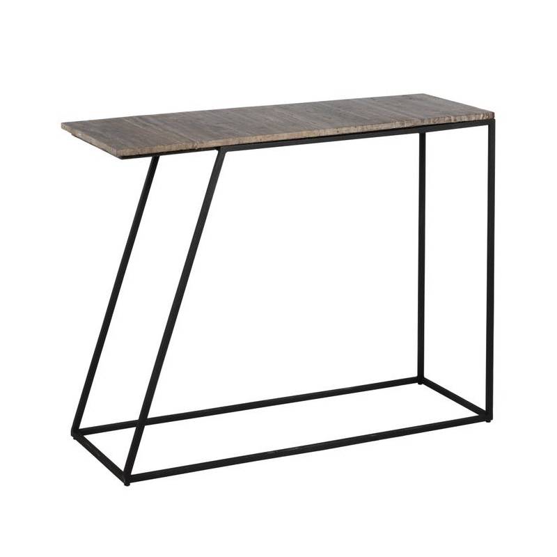 Elegantiška konsolė su travertino marmuro stalviršiu ir juoda geležine konstrukcija – išraiškinga detalė prieškambariui ar svetainei.