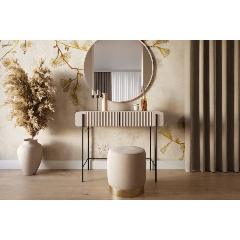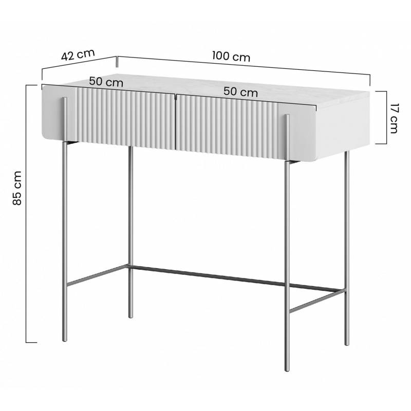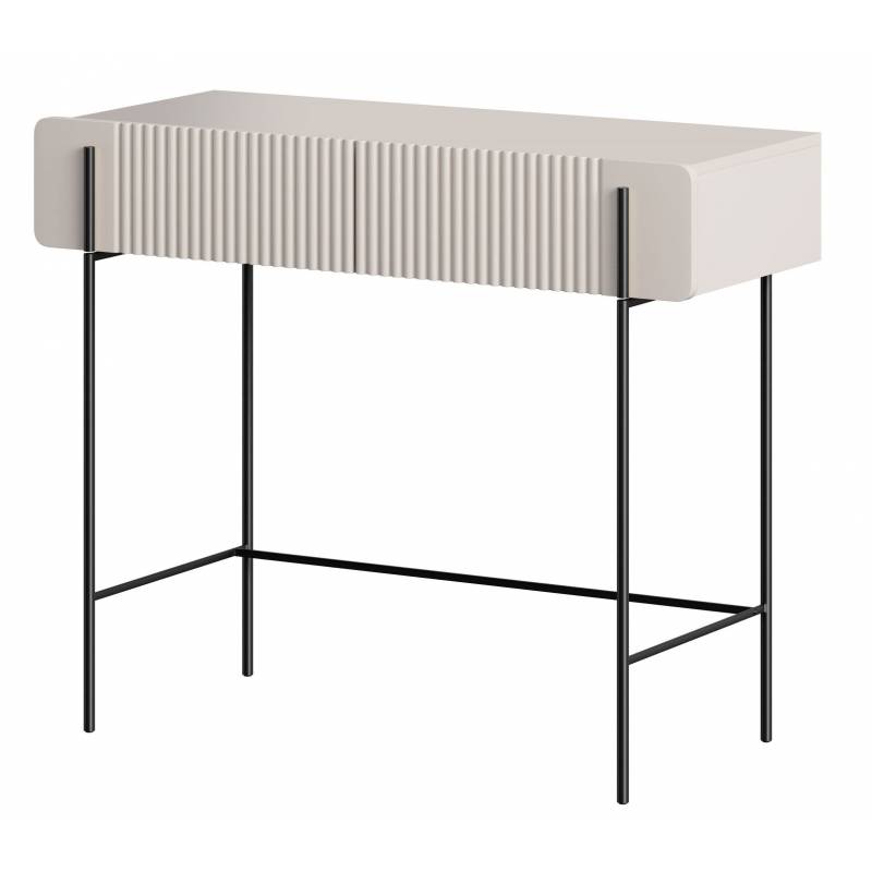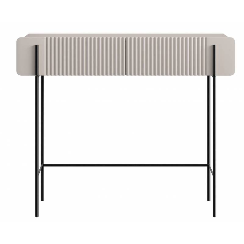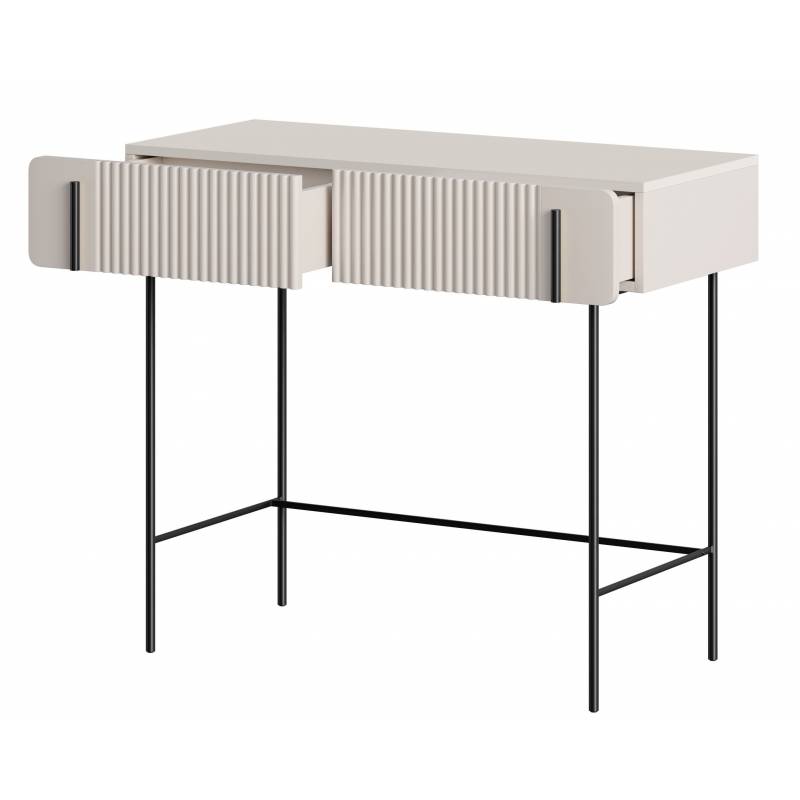 Metalinis rėmo tipo pagrindas suteikia stabilumo ir vizualinio lengvumo pojūtį, o veltinio padeliai saugo grindis nuo subraižymo. Konsolė turi erdvų stalčių, kuris atsidaro paspaudus – be rankenėlių, išlaikant švarų, modernų dizainą. Švelnaus uždarymo sistema užtikrina tylų naudojimą, todėl šis baldas puikiai tinka tiek miegamajame, tiek koridoriuje ar svetainėje.