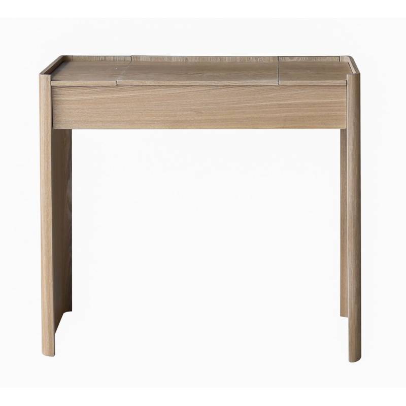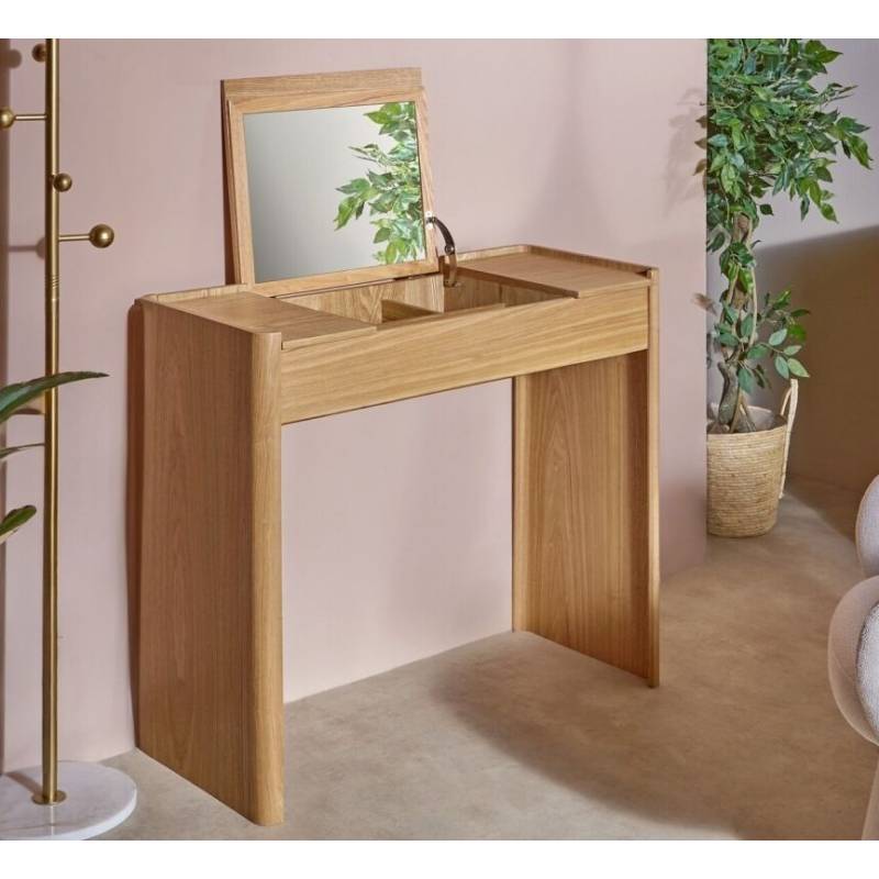 Kosmetinis staliukas - konsolė su veidrodžiu, pagamintas iš uosio lukšto, elegantiškas ir funkcionalus miegamajam.