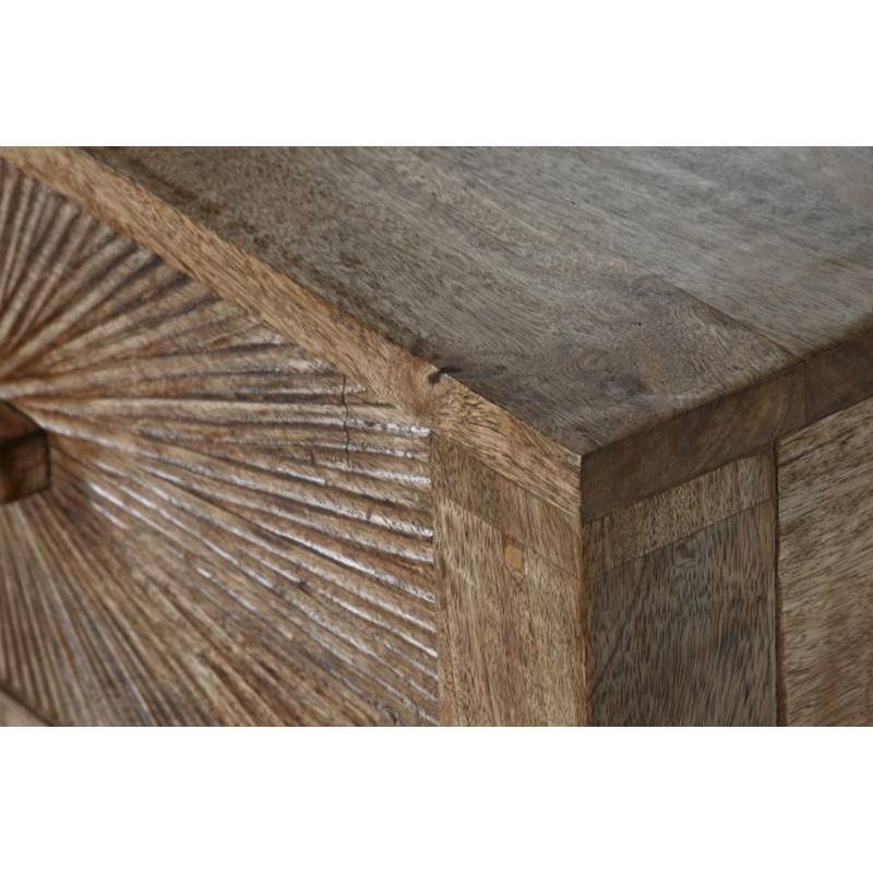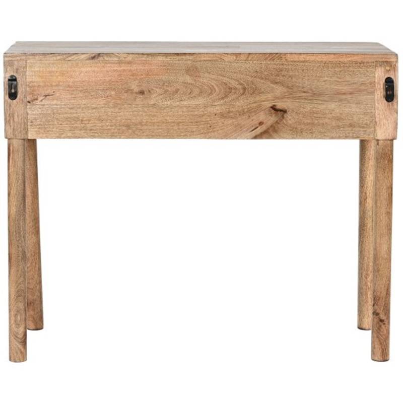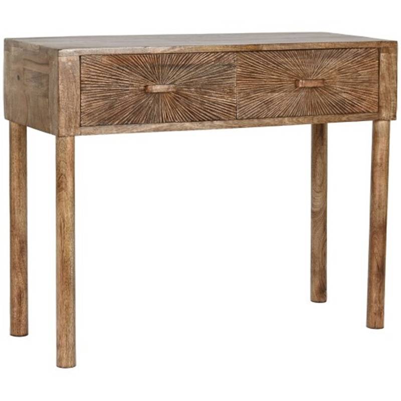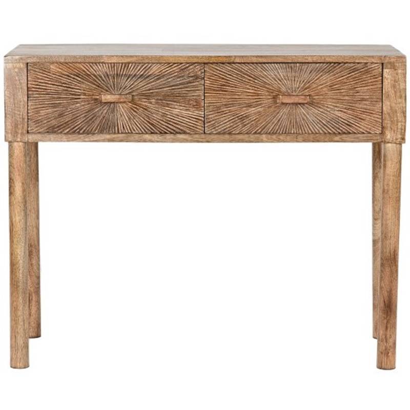 Unikalus baldas – konsolė SUN. Pagaminta iš tvirtos mango medienos, kuri pasižymi ne tik patvarumu, bet ir unikaliais raštais ir atspalviais. Konsolė turi 2 stalčiukus su medinėmis rankenėlėmis. Stalčiukų priekis dekoruotas raižiniais. Konsolė gali būti montuojama prie sienos, gale yra pritaisytos auselės montavimui. Kojelės stambios, apvalios.