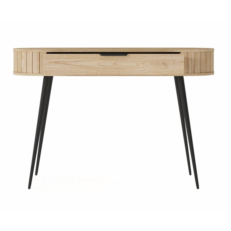 Moderni konsolė su frezuotais fasadais ir push to open sistema, ąžuolo spalvos su juodomis kojomis suteikia interjerui elegancijos.