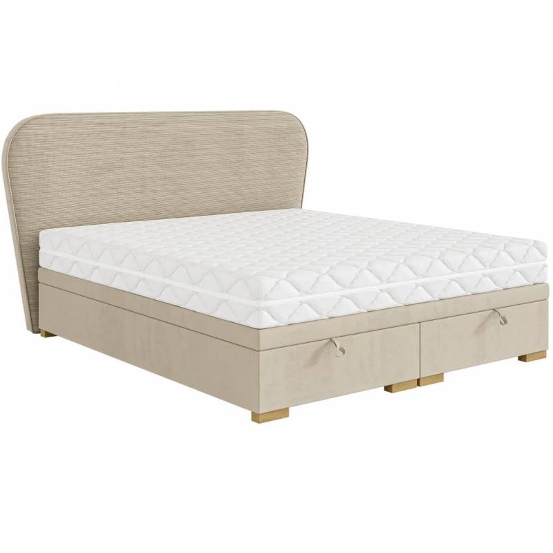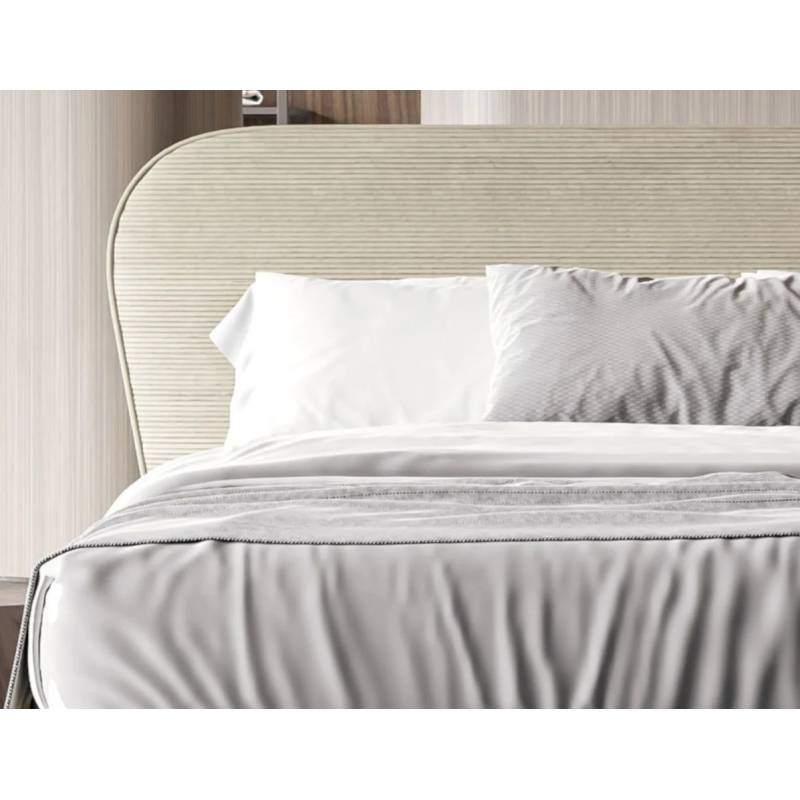 Ši lova išsiskiria originaliu, apverstos trapecijos formos galvūgaliu, aptrauktu minkštu stucco audiniu, kuris suteikia interjerui modernų ir rafinuotą akcentą. Tvirta dėžės tipo konstrukcija iš baltos plokštės ir medinio rėmo užtikrina ilgaamžiškumą bei stabilumą.