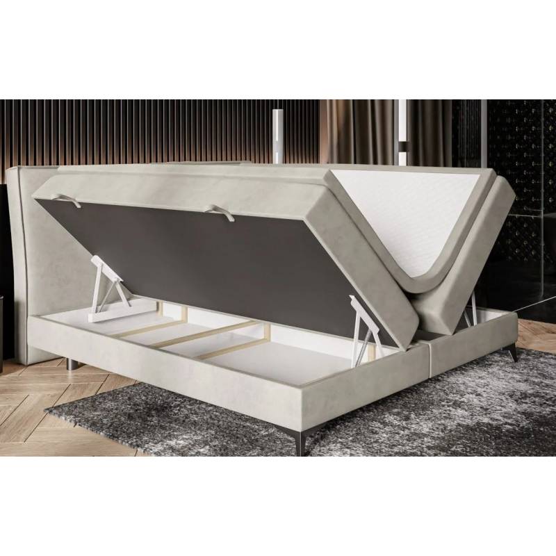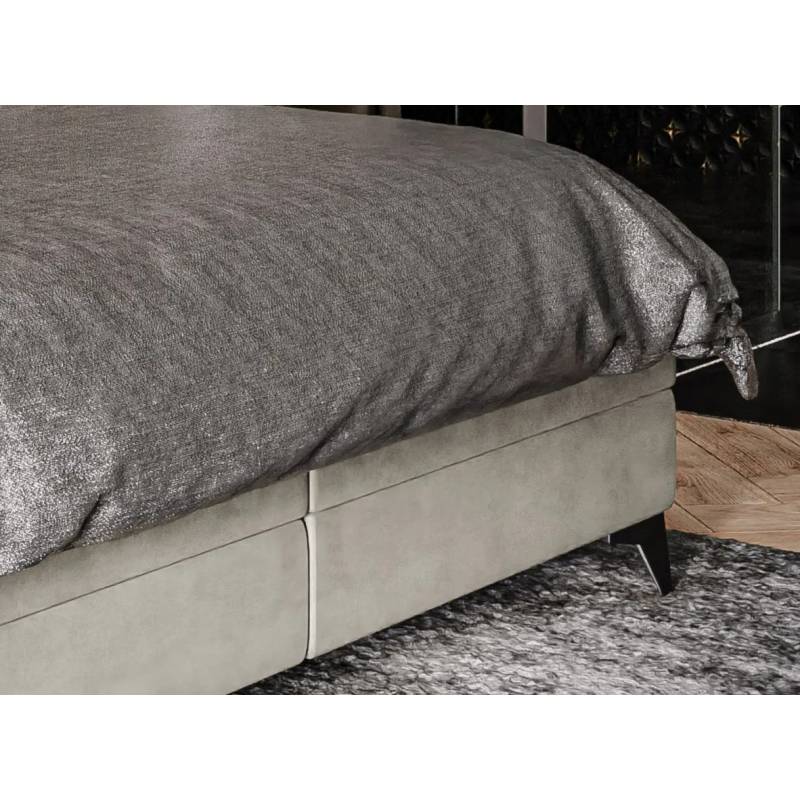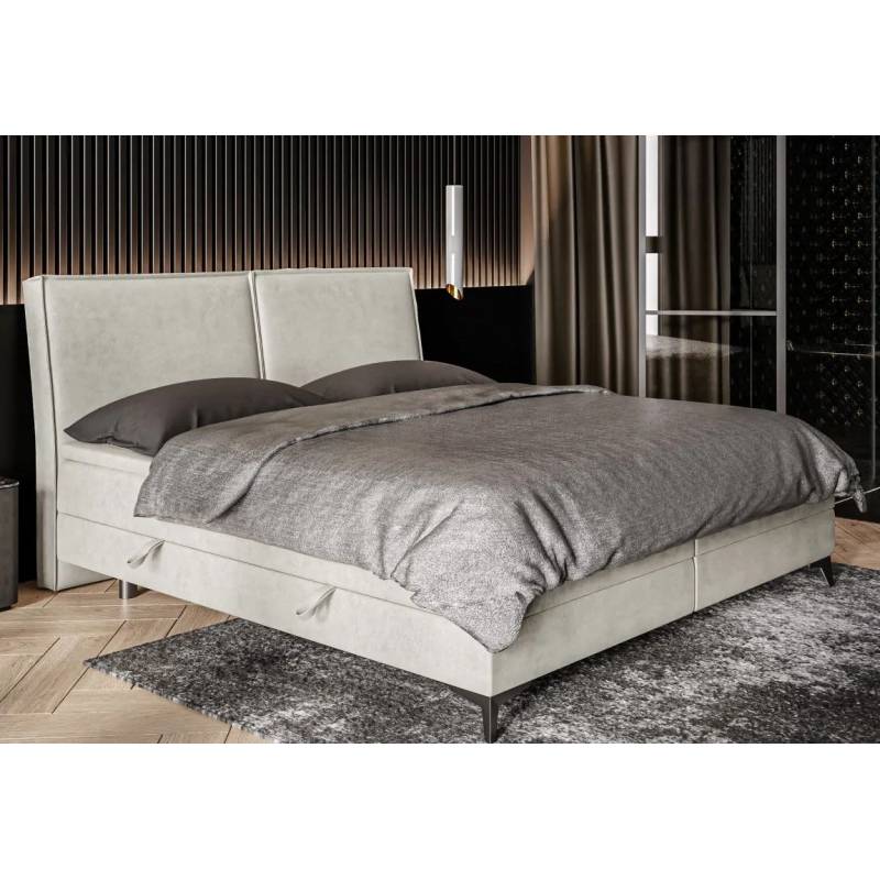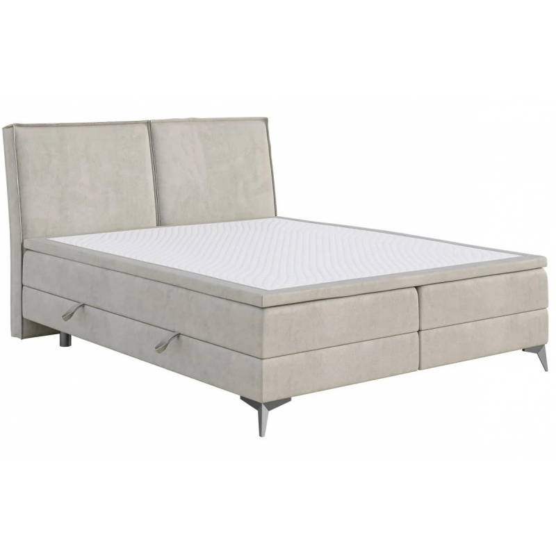 LOLLY – elegantiška lova su galvūgaliu, padalintu į dvi lygias dalis, kurias puošia dekoratyvinis siūlas, suteikiantis subtilaus išskirtinumo. Tvirta balta bazė derina funkcionalumą ir estetiką, o patogus čiužinys užtikrina malonų poilsį. Juodos metalinės kojelės įneša modernumo, todėl ši lova puikiai tiks įvairaus stiliaus interjeruose. Lova taip pat turi dvi patalynės dėžes.