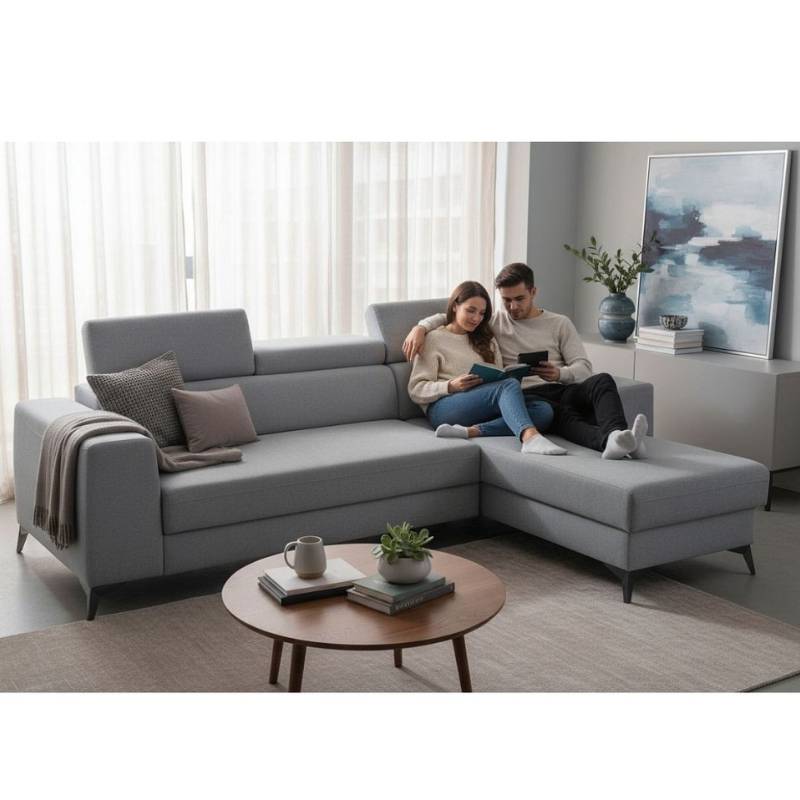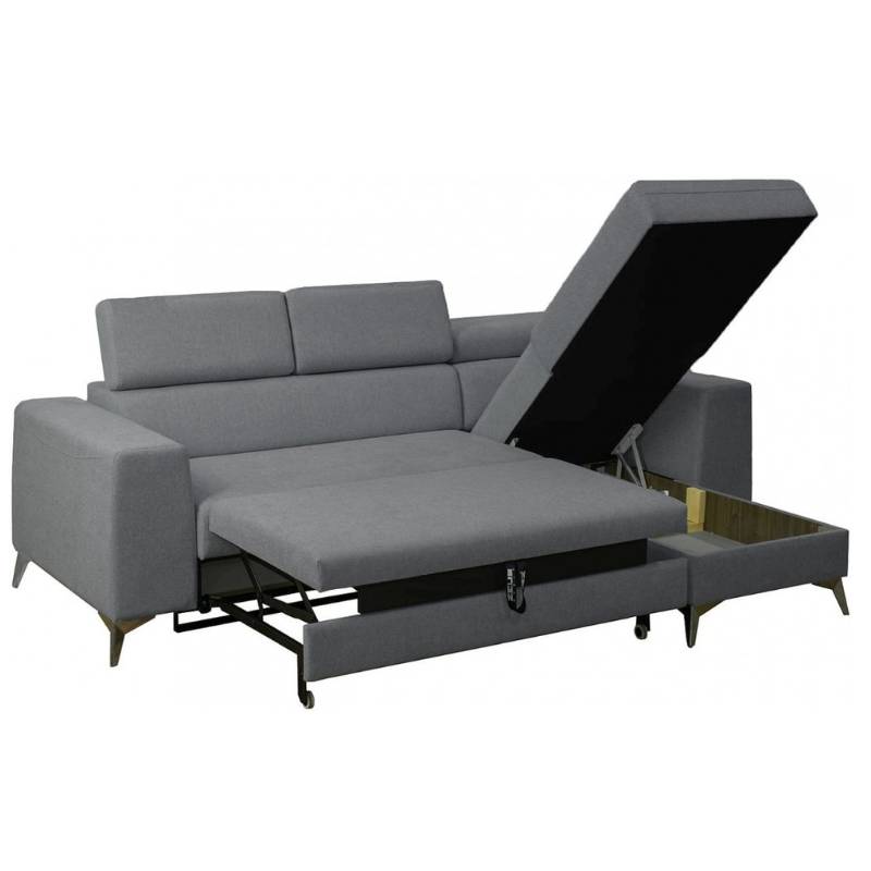 Kompaktiškas minkštas kampas su miegama funkcija ir patalynės dėže, suteikiantis komfortą ir praktiškumą kasdien.