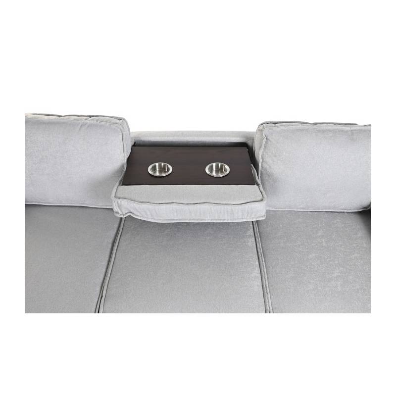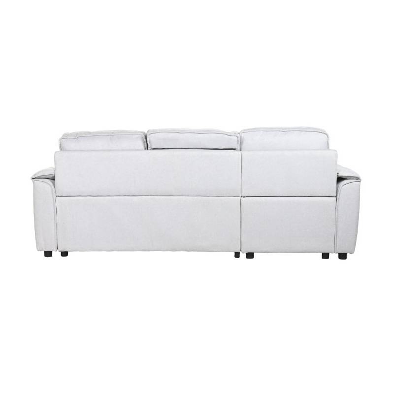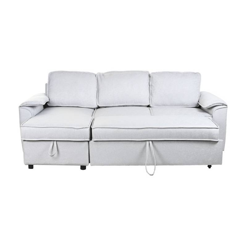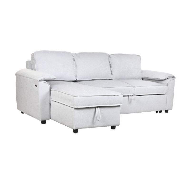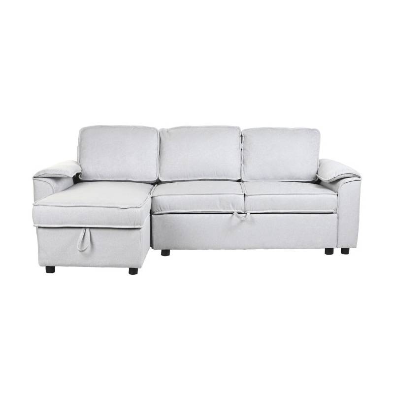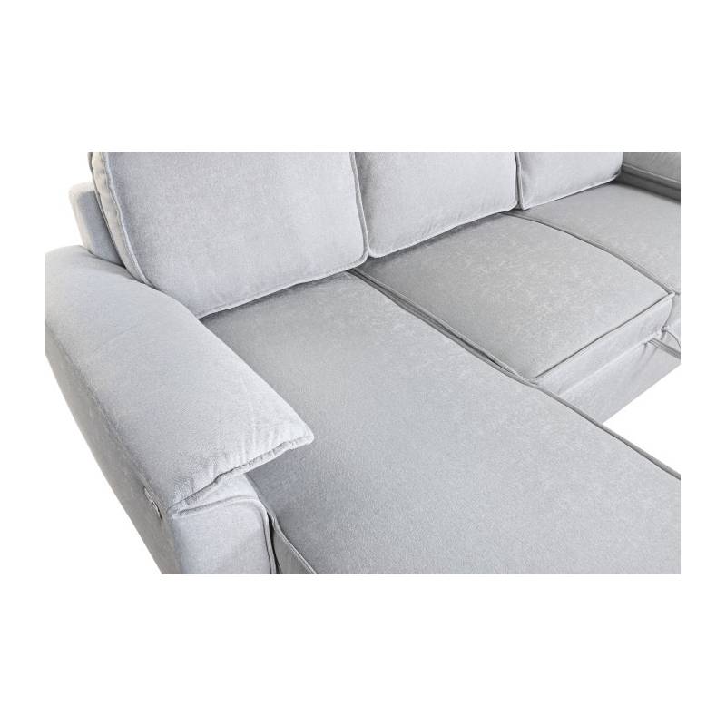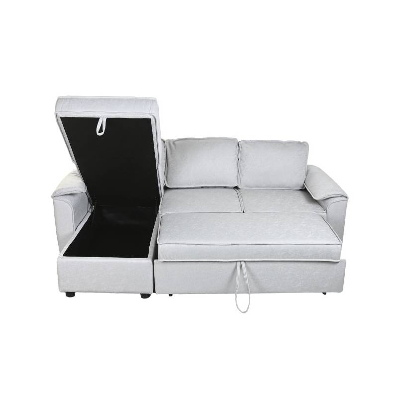 MODERN – šviesiai pilkos spalvos minkštas kampas su miegama funkcija, aptrauktas poliesteriu, pritaikytas šiuolaikiniam interjerui.