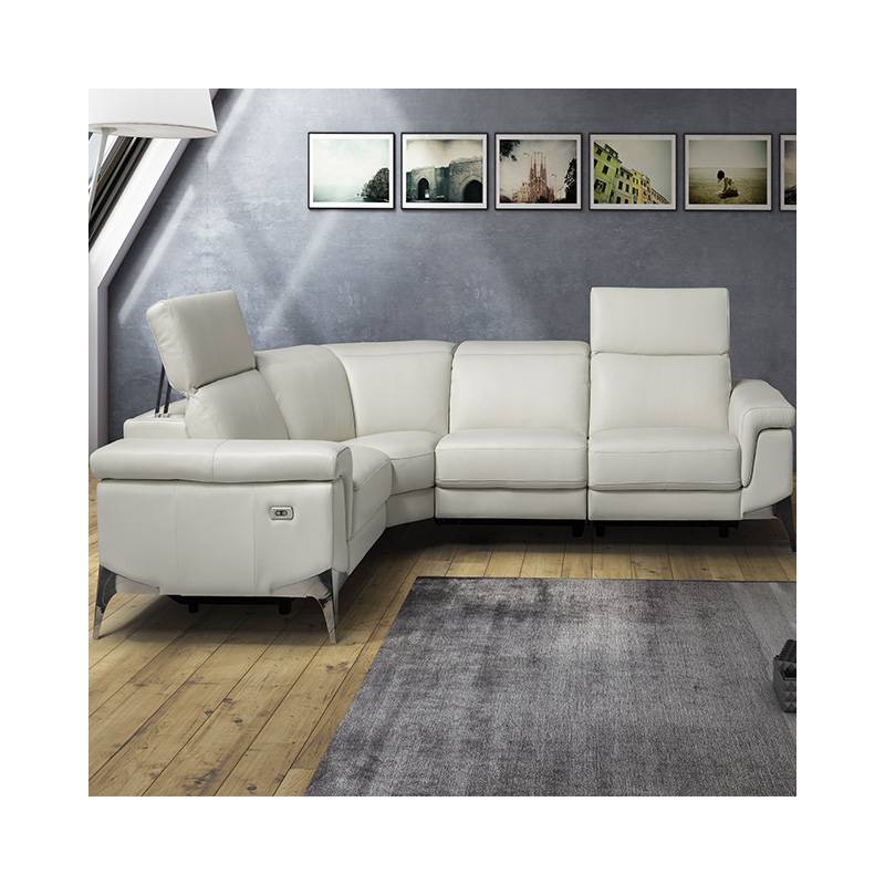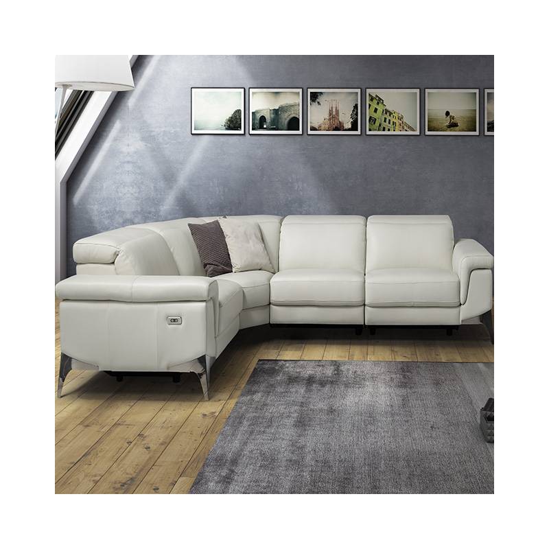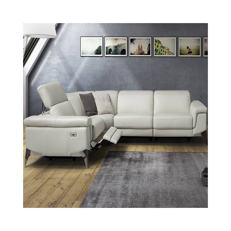 Modernus minkštas kampas su reguliuojamais galvos atlošais, aukšto komforto sėdynėmis ir pasirinkimu rinktis odą ar audinį. Galimi elektriniai reglaineriai.