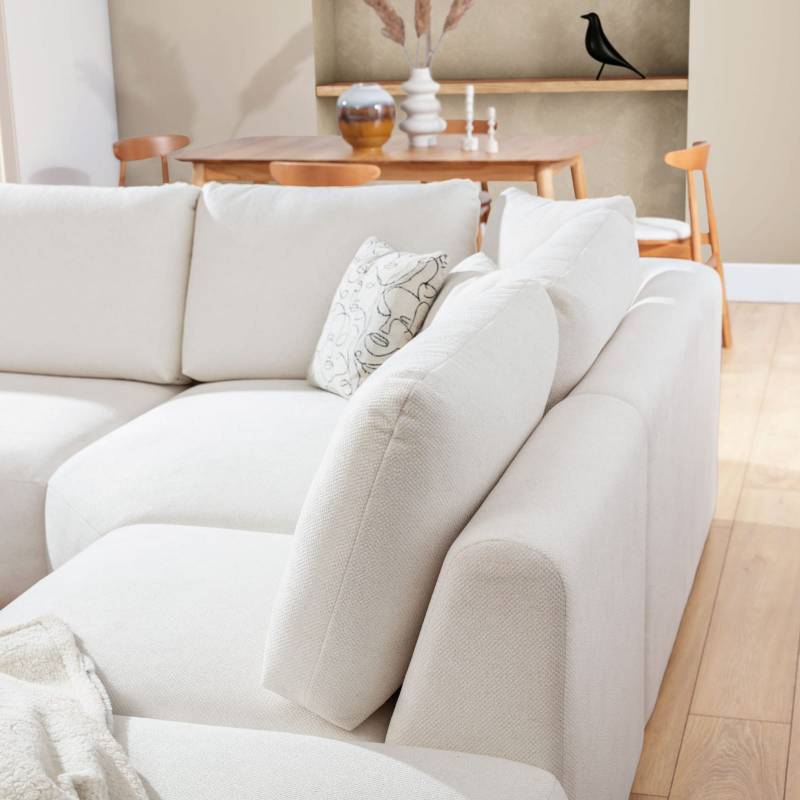DIONIZOS modulinė sofa išsiskiria šiuolaikišku dizainu, šviesiu ir vizualiai lengvu siluetu bei ypatingu komfortu. Gilios, minkštos sėdimosios dalys užtikrina maksimalų atsipalaidavimą, o U formos išdėstymas puikiai tinka tiek šeimos poilsiui, tiek svečių priėmimui.