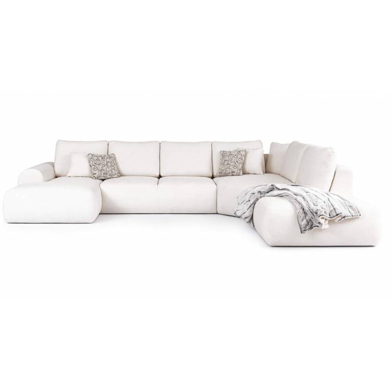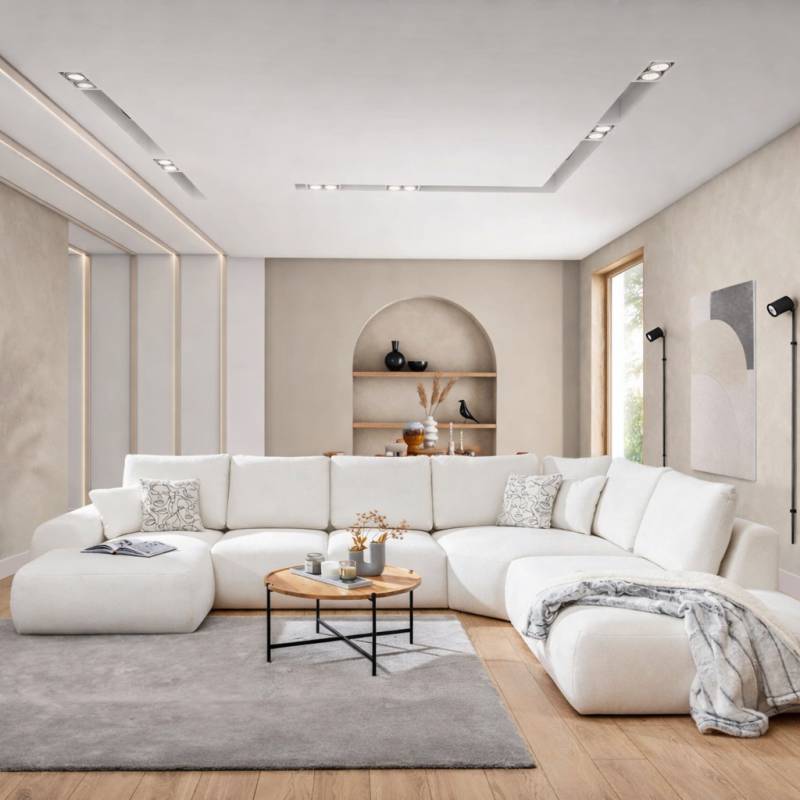 Erdvi modulinė U formos sofa su itin patogiomis sėdimomis vietomis, elegantiška ir lengvai pritaikoma įvairiems interjerams.